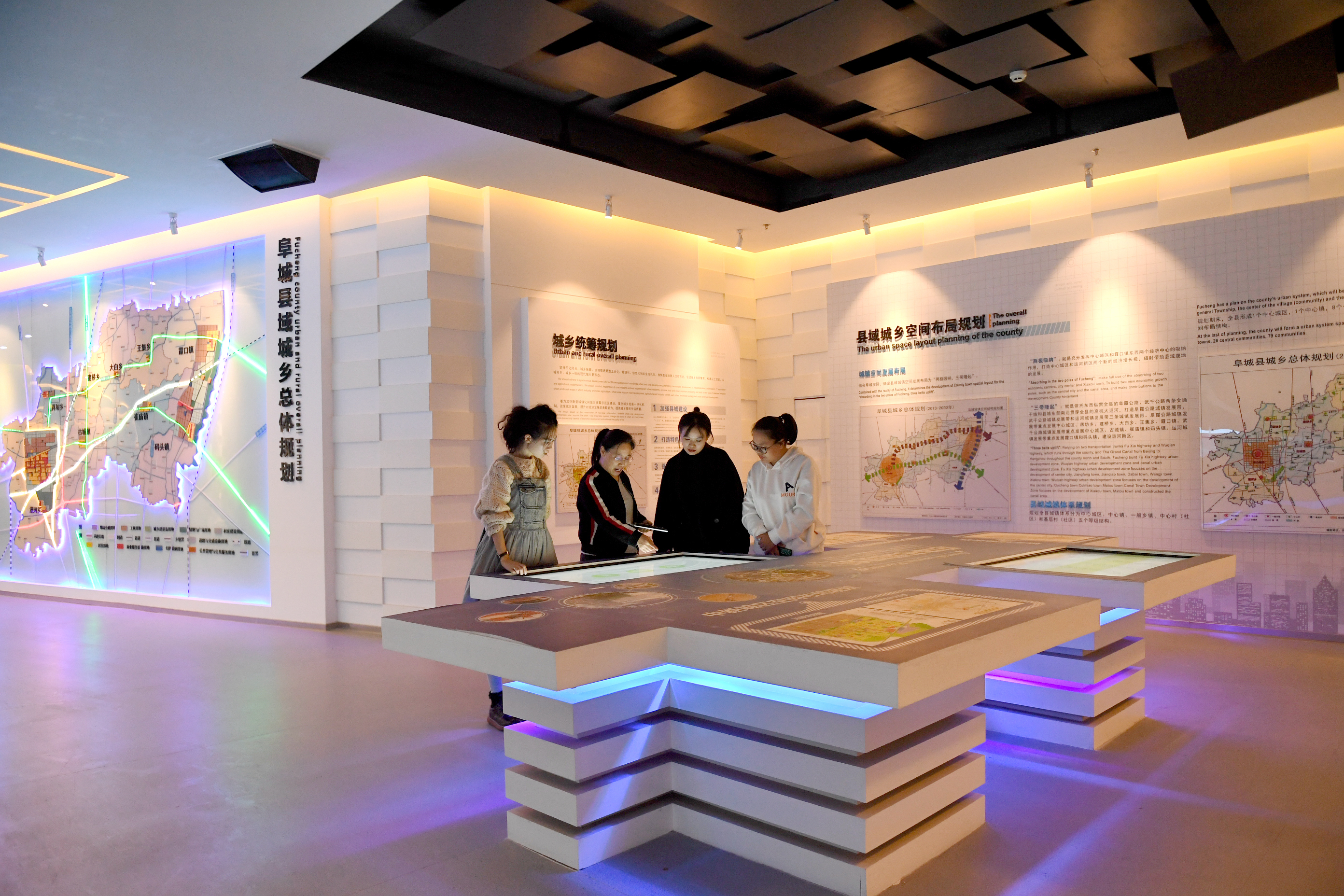 館內設有道德模范事跡展、產業發展、規劃成果等展廳,還有未成年教育、核心價值觀、地方特色等展板。采用的現代化展陳模式令人耳目一新。在二樓展廳中央,設有一個建設成就成長樹演繹裝置,通過對應黑色感應器生成感應,滑至5個圖片一組至感應器的地方,就會生成一個二維碼,用手機掃描這個二維碼,這些美麗的圖片就下載到手機上。這些圖片反映出近年來,阜城縣在經濟、產業、城鄉發展、生態環境、社會事業、人民生活水平方面實現了跨越性的發展。這種展陳方式給觀眾帶來了互動體驗的樂趣。戰略總歸廳里大型沉浸式LED數字沙盤,分為空間屏和地幕兩大部分,以“圓夢冀中南,宜居新阜城” 為主題,通過視覺、聽覺、變幻的燈光效果形成立體空間,全方位感受阜城的發展之路,成為館內一大亮點。