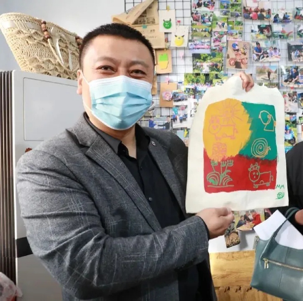 愛心人士展示心智障礙少年兒童繪制并贈送的帆布包。李新 攝