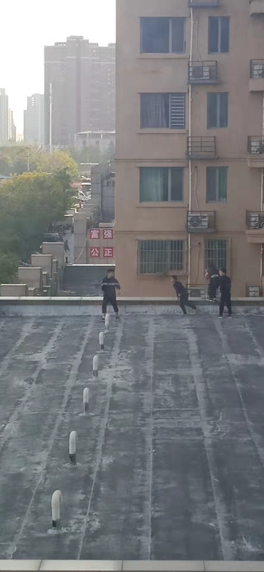 當日下午3時許,小區居民張先生透過自家外窗玻璃,恰巧看到了這一幕,驚得出了一身冷汗。“我看見的時候,4個小男孩已經上了二層臨街商鋪的房頂,正順著梯子向三層攀爬。他們爬上去之后,就在樓頂跑動,偶爾趴在圍墻處朝下頭張望,看上去十分危險。最令人擔心的是,周圍也沒有家長勸阻。”張先生告訴記者,就在上周周末,他也曾看到過有小朋友攀爬臨街商鋪的外墻,上樓頂玩耍。“盡管樓頂有一段圍墻,但高度實在是太低了,小朋友們跑動、向下張望極易發生意外。此外,他們在樓頂投石子、摸光纜也十分不安全,還有可能給自己或者他人造成傷害。”由于一直沒有家長出面勸阻這些小朋友,張先生擔心他們出現意外,遂錄制了視頻發到小區業主群內,提醒物業人員和家長們注意,也希望家長們看好教育好自己的孩子,切莫在高處攀爬玩耍,以免造成傷害。