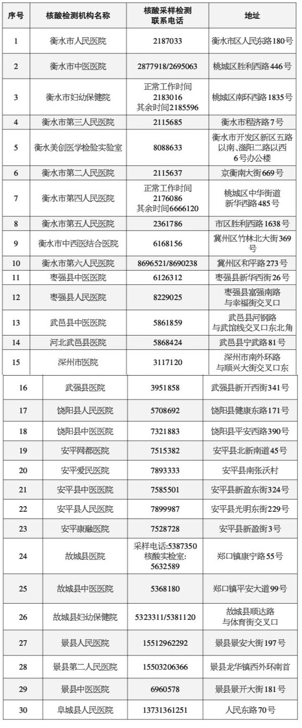 從衡水市衛(wèi)健委獲悉,為方便市民查詢和就近選擇核酸檢測采樣服務(wù),衡水市衛(wèi)健委對全市提供24小時核酸檢測服務(wù)的檢測機構(gòu)信息進行了匯總。截至2021年11月1日,全市共30家核酸檢測服務(wù)機構(gòu)可提供24小時服務(wù)。