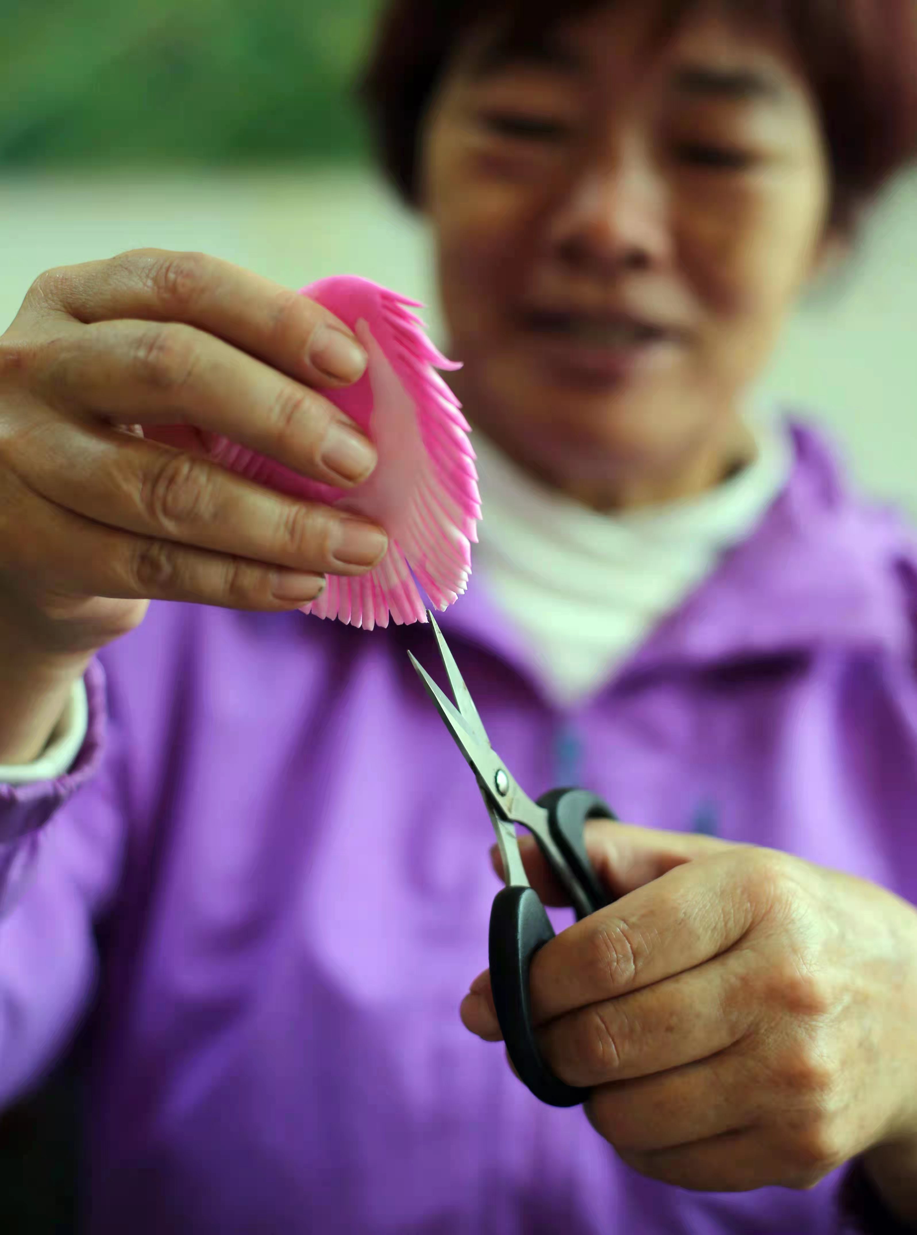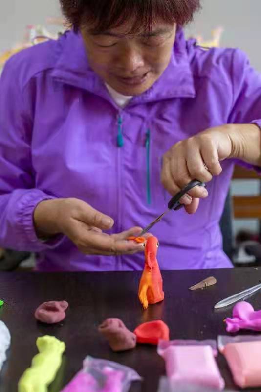 這些藝術(shù)生靈的主人張夢君也擁有一顆純真的童心,干凈的眸子、樸實(shí)的笑容,讓所有見到她的人感覺親切和寧靜。她沒有城里人時(shí)髦的服裝,沒有白皙的皮膚,只有一雙略顯粗糙的勞動者的巧手,卻像魔術(shù)師一樣,把不同顏色的粘土在手里揉、搓、捏,分分鐘就賦予它們生命的靈動。