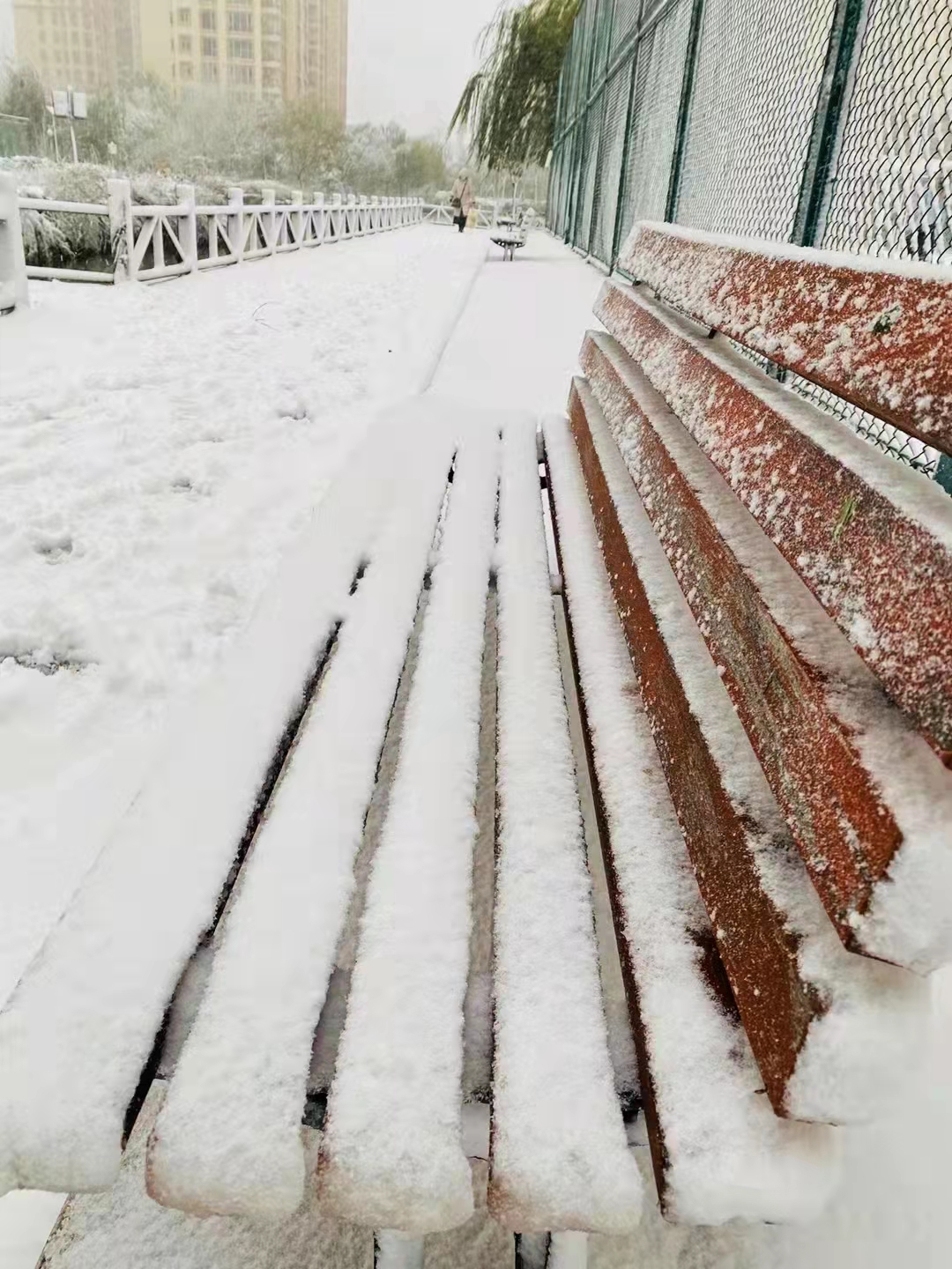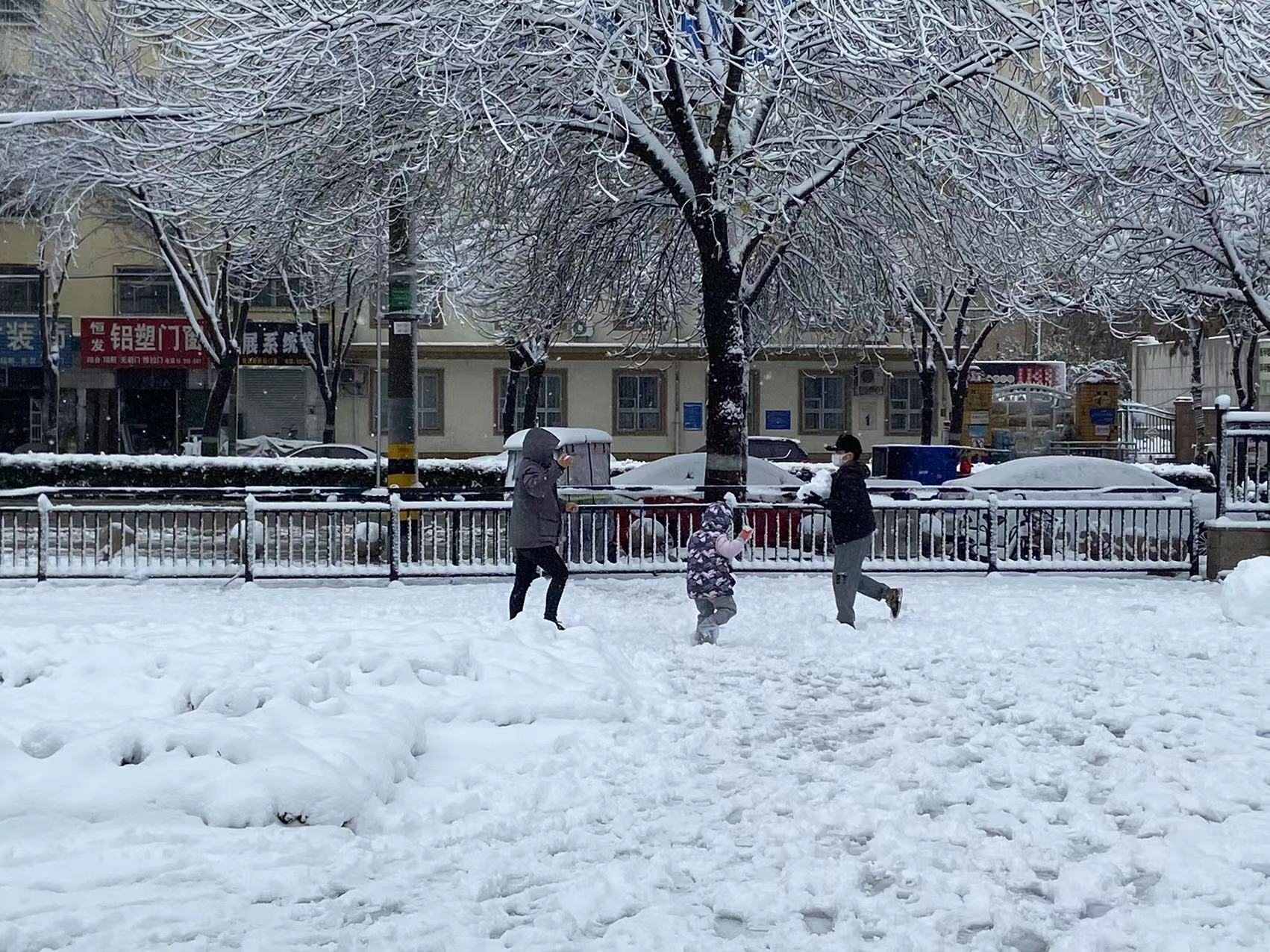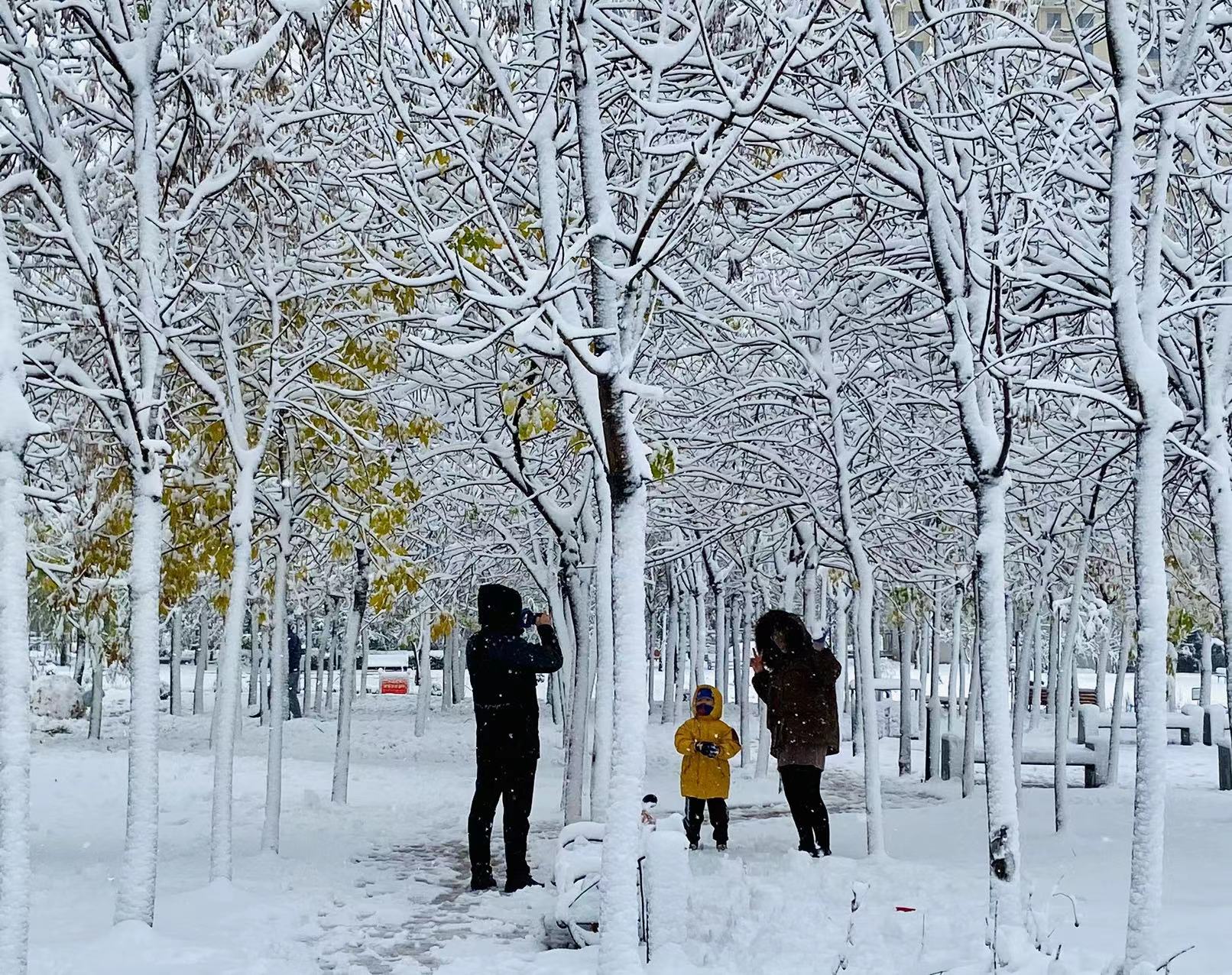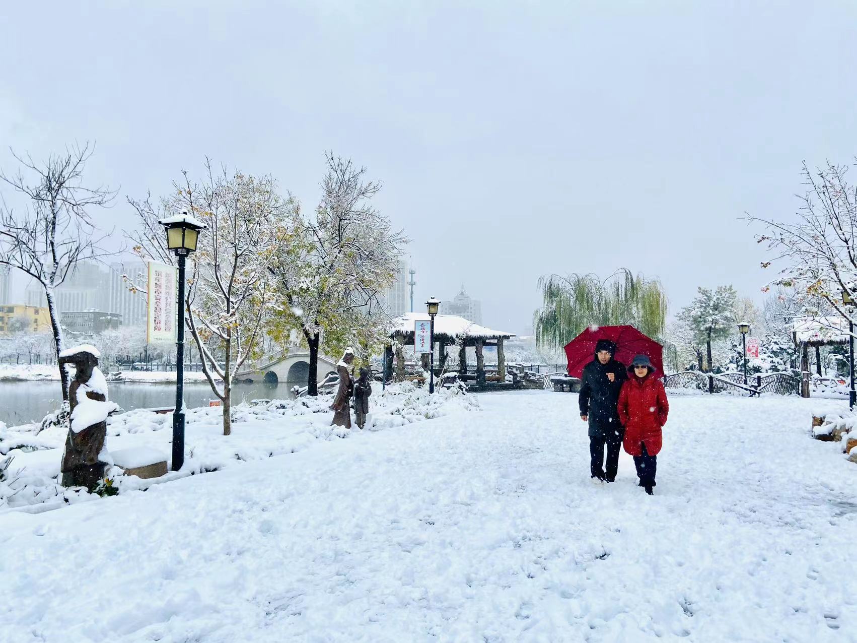 樓下的草還綠著,花還紅著,枝頭還掛著來不及變黃的樹葉,一場雪的到來,全都變成了統一的顏色。調皮的雪,將街頭的長椅坐滿,給汽車蓋上白色的“車衣”,將衡水湖畔的蘆葦壓彎。