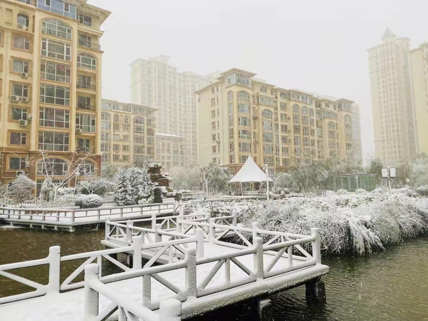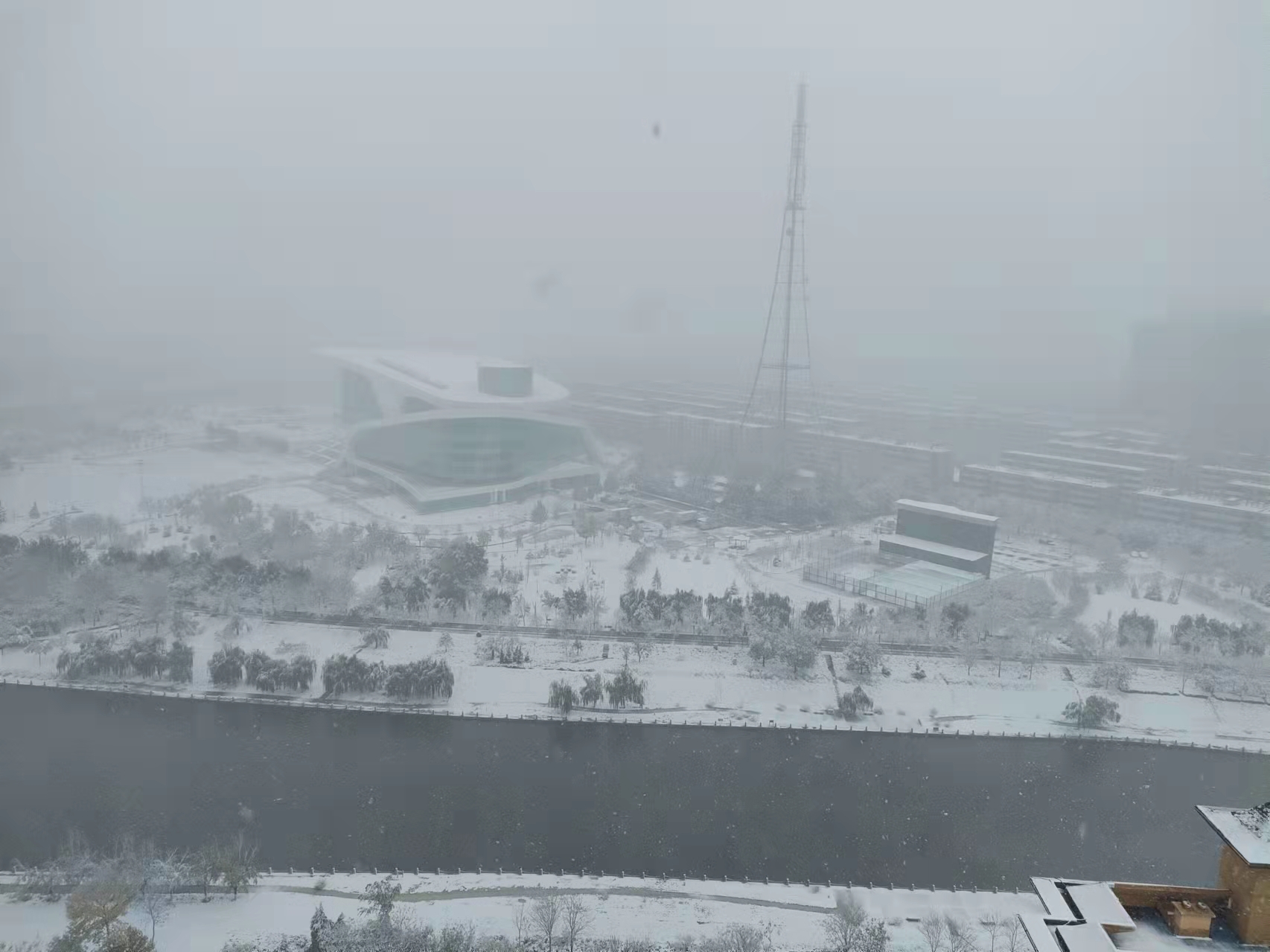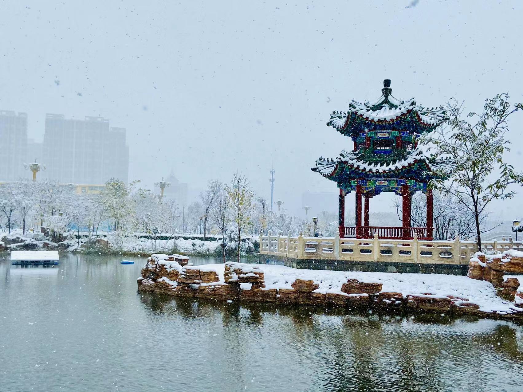 美麗的滏陽河邊,白色的積雪將大地、河水及灰蒙蒙的天空連成一片,純白的色彩與建筑、風景相融相和,一地雪印,雪中一片黃葉,都定格為城市最美好的記憶。