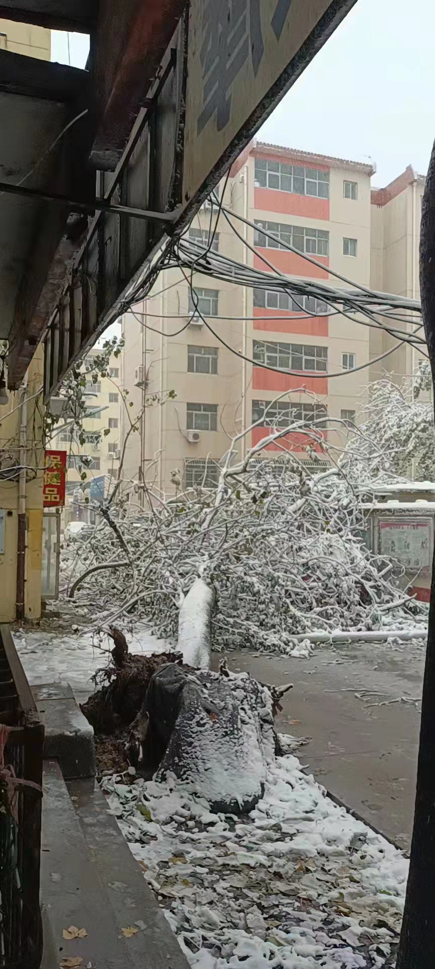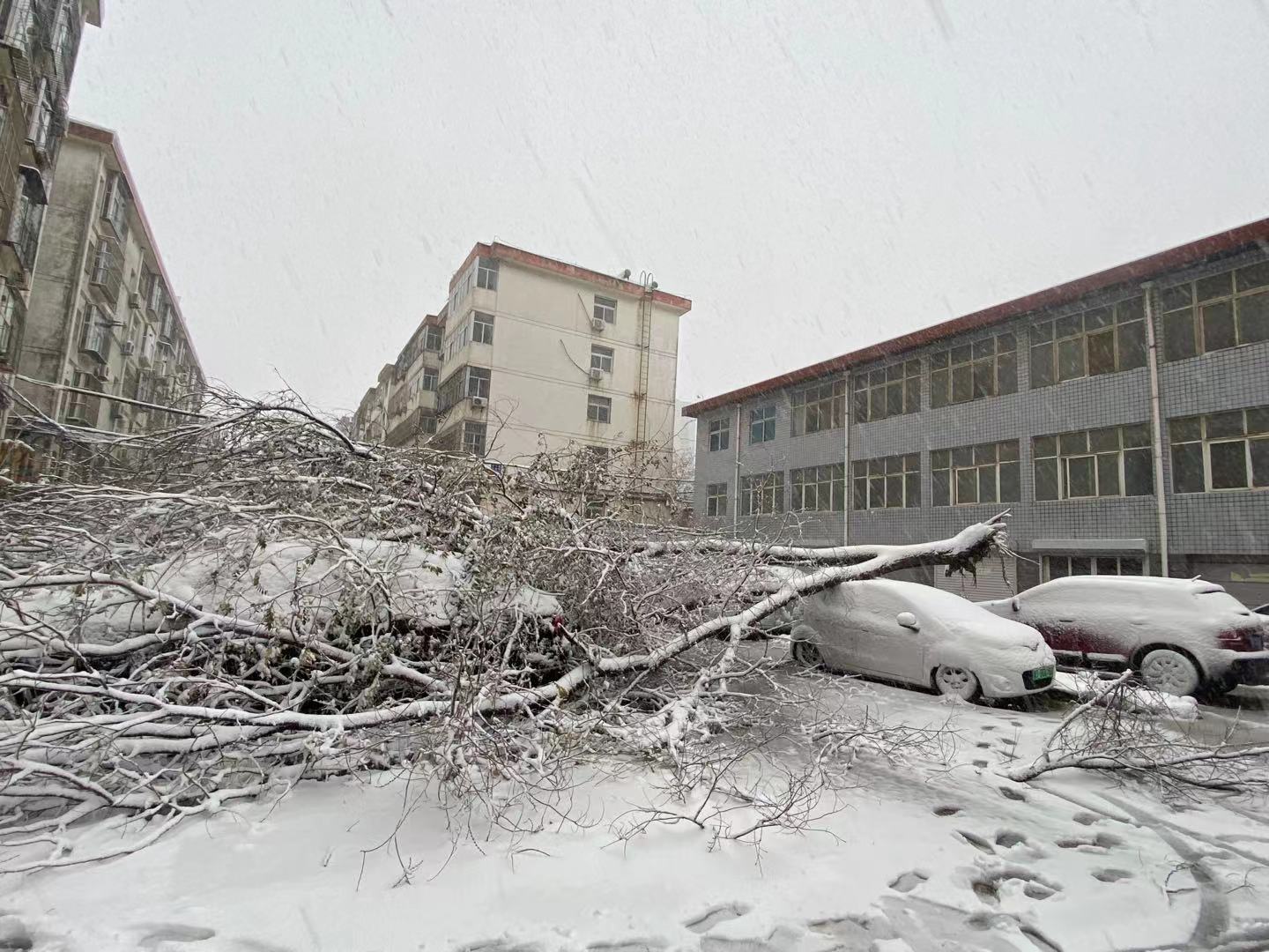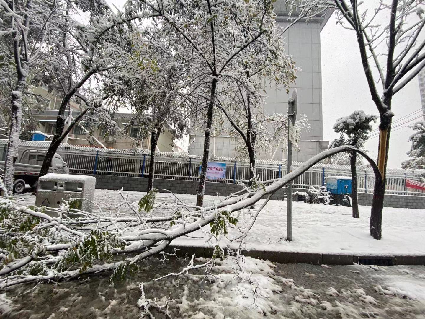 雪帶來驚喜,也帶來一些麻煩。因為積雪沉重,不少樹枝被壓斷,還有大樹承受不了雪的重量,直接連根拔倒。不少園林工人一早就忙著將折斷的大樹和枝條清理干凈。