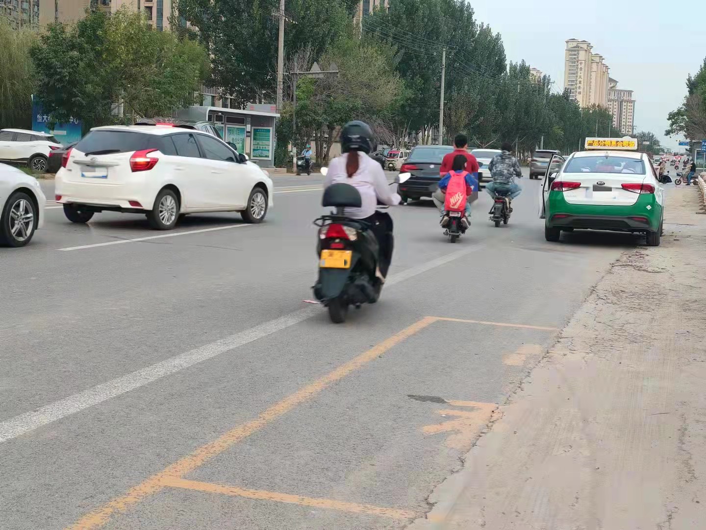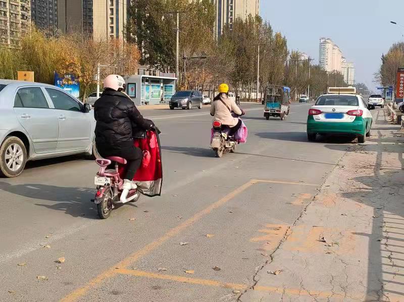 11月6日下午,記者來到市民所反映的衡水市民中心附近,發現南外環是雙向四車道,最外側是非機動車道。在衡水市民中心出入口處的非機動車道上設置有幾個寫有“出租專用”的黃色待客位,上面停著出租車。只見車位標線占用了一大半非機動車道,只給非機動車留下了半米多寬的行駛空間,路過的電動車或自行車為躲避停靠的車輛,不得不到機動車道上繞行。