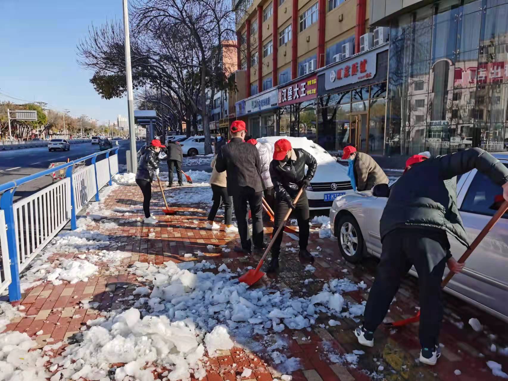 8日上午,因為積雪融化成冰,開始變得難以清理。在市區人民路哈院北側的公交站點,衡水市人壽保險公司的志愿者們身穿紅馬甲,拿著清雪工具用力鏟除路面冰層,清理后的便道路段,干凈整潔,極大地方便了群眾交通出行。與此同時,在報社街北,衡水日報社的志愿服務隊來到分包路段,鏟除便道停車位上的路面積雪,確保了行人和車輛的安全,受到了過往群眾的一致稱贊。