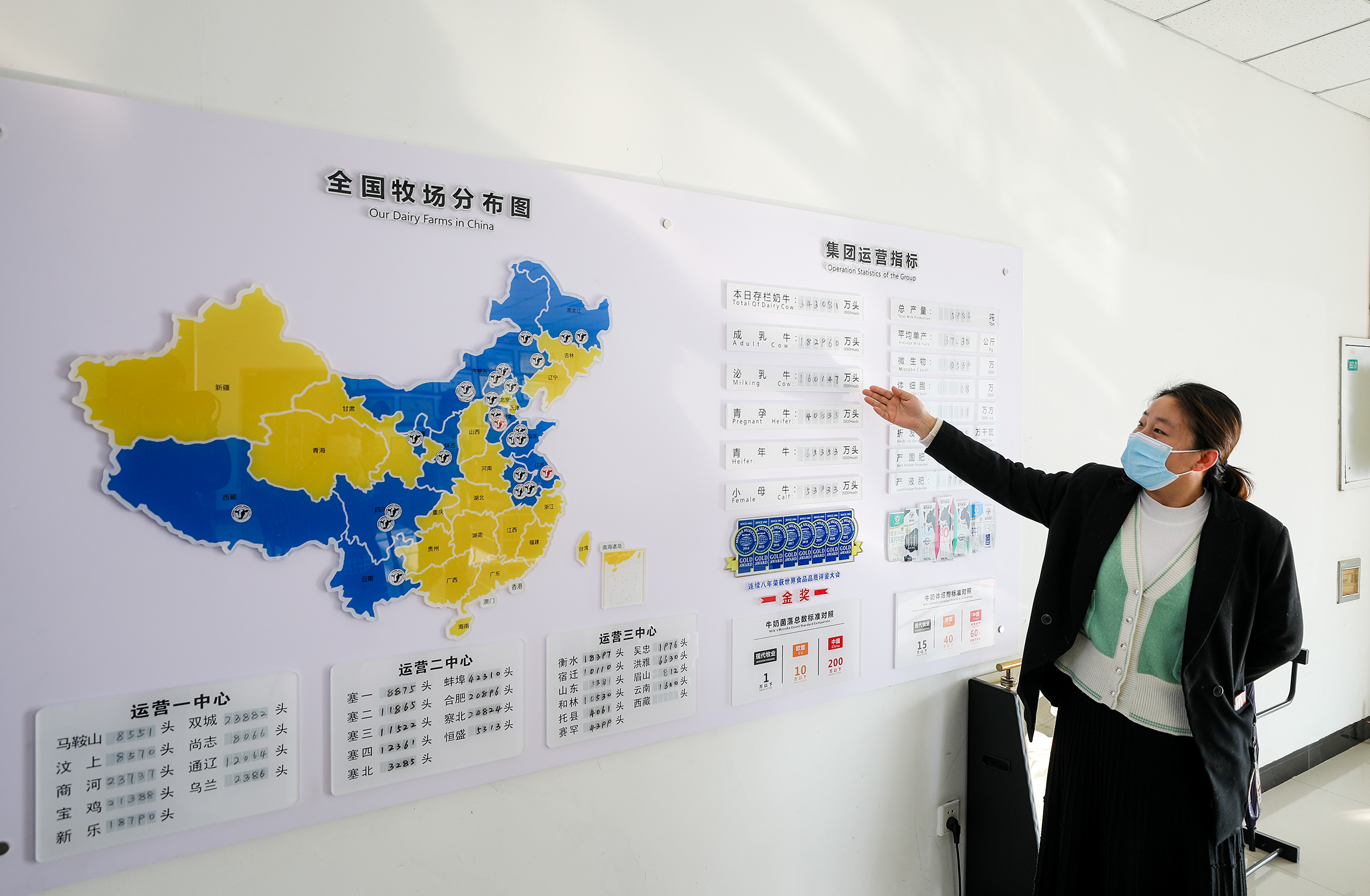 富源牧業(yè)工作人員在介紹集團(tuán)牧場(chǎng)奶牛存欄動(dòng)態(tài),牧場(chǎng)是蒙牛奶業(yè)的鮮奶提供商。