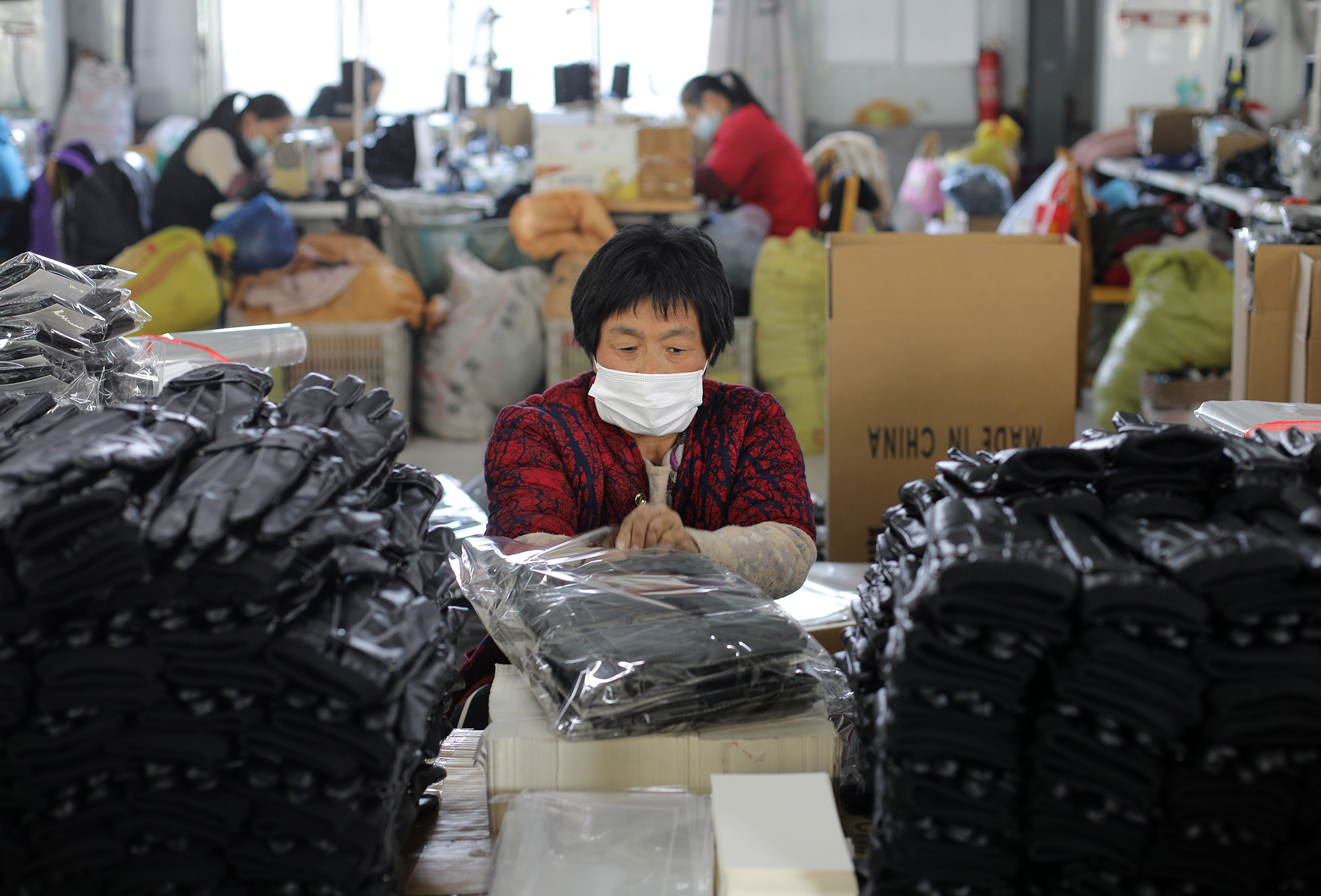 手套加工車(chē)間工人正在進(jìn)行成品打包。