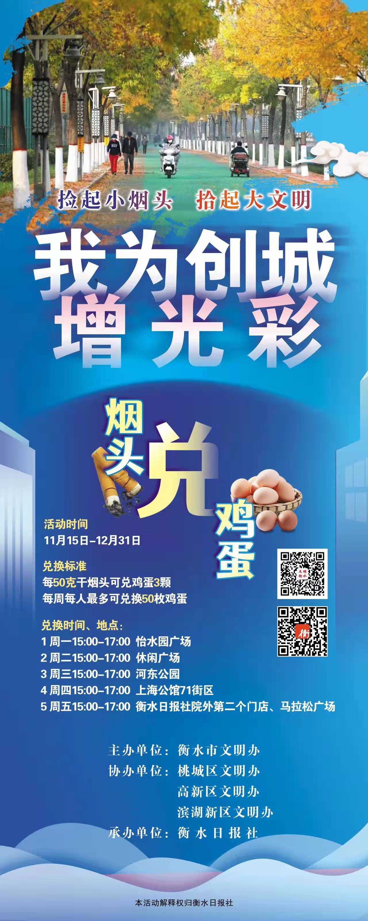 煙頭雖小,卻直接影響著城市的文明形象。為進(jìn)一步提升市民文明素質(zhì),掀起廣大市民參與文明城市創(chuàng)建的熱潮,營造干凈、整潔、健康、文明的城市形象,11月15日起,由衡水市文明辦主辦,桃城區(qū)文明辦、高新區(qū)文明辦、濱湖新區(qū)文明辦協(xié)辦,衡水日報社承辦的“撿起小煙頭 拾起大文明——我為創(chuàng)城增光彩”志愿服務(wù)活動將在衡水市區(qū)啟動。屆時,將邀請廣大市民朋友一起來參與進(jìn)來,市民只需在市區(qū)廣場區(qū)域撿拾一定數(shù)量煙頭,即可在指定地點(diǎn)兌換雞蛋。