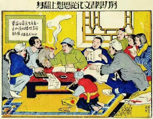 書中入選的武強(qiáng)年畫作品《努力學(xué)習(xí)文化 從思想上翻身》。河北武強(qiáng)畫社供圖