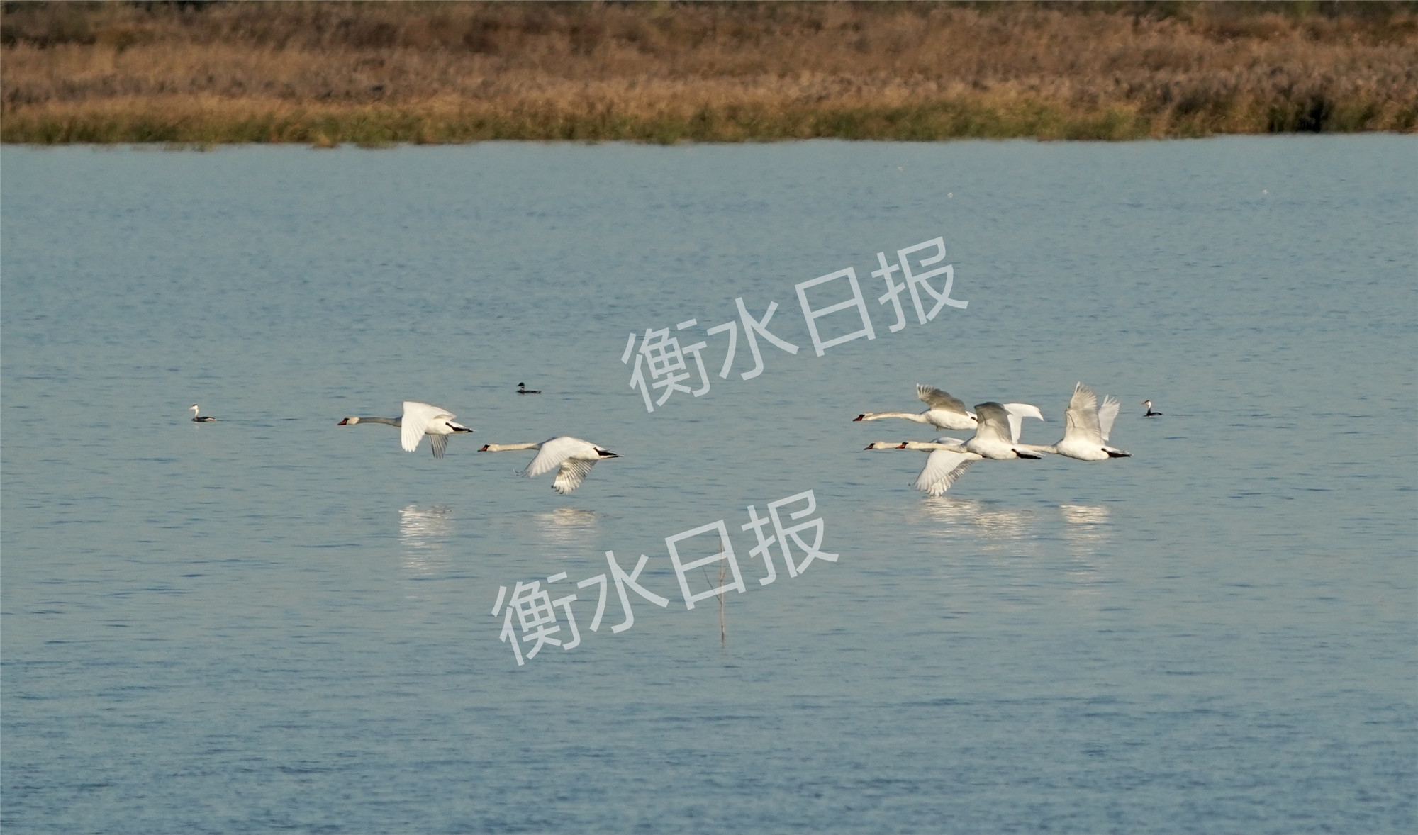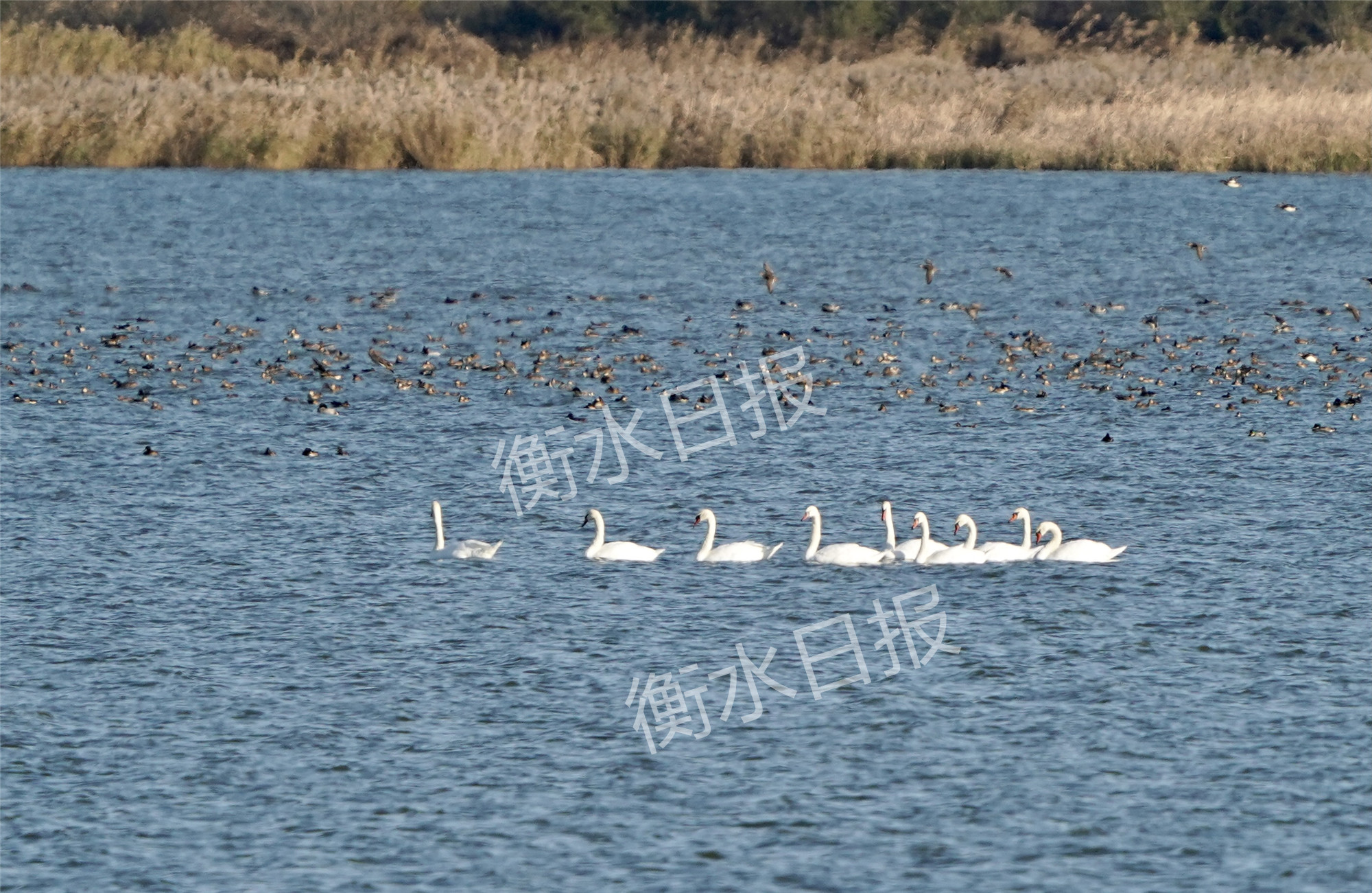 根據記錄,之前在衡水湖曾觀測到一只疣鼻天鵝,此次湖面上停留了9只,大的5只,小的4只,實屬罕見。