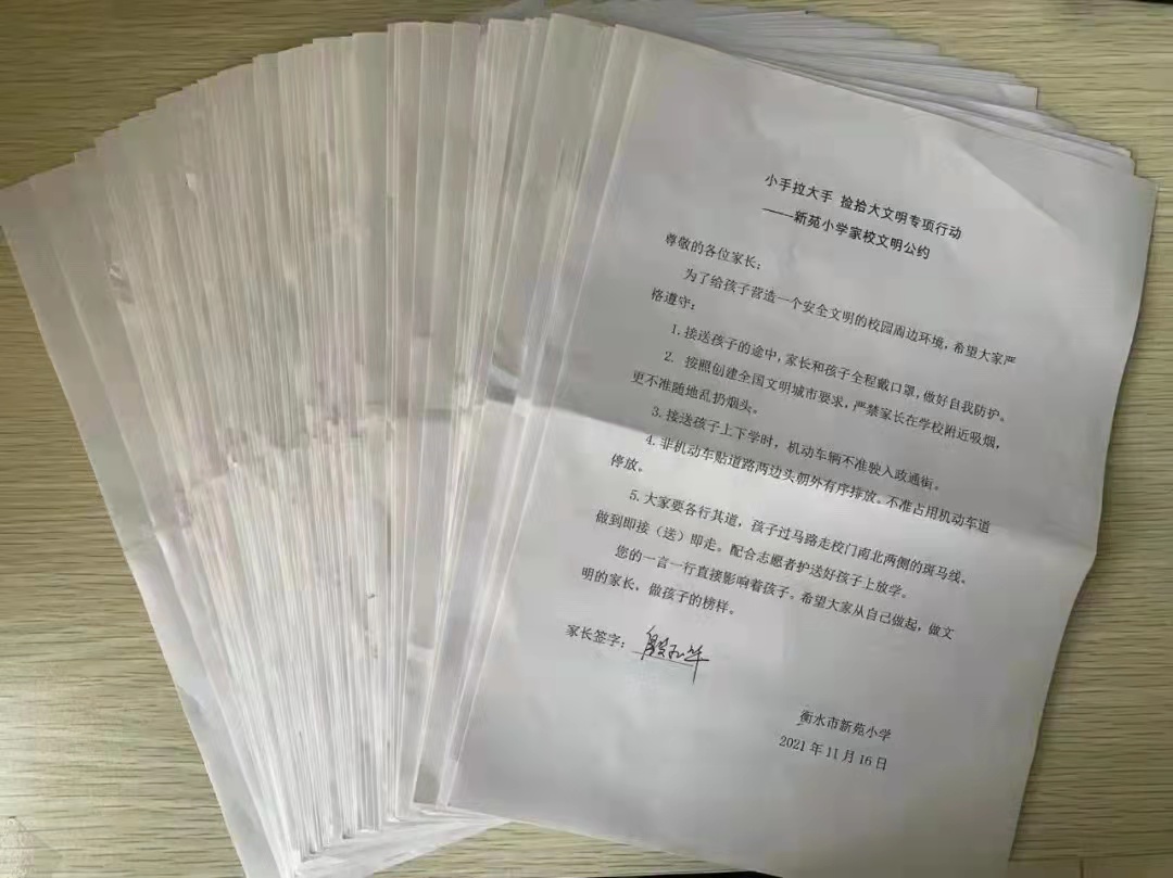 學生與家長簽訂《控煙衛生文明志愿者承諾書》,家長簽訂《小手拉大手 撿拾大文明專項行動文明公約》……近日一股家校文明之風在新苑小學流行開來。