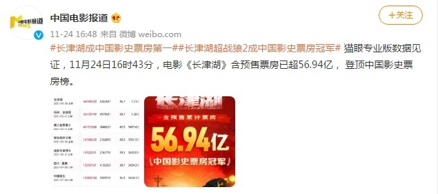貓眼專業版數據見證,11月24日16時43分,電影《長津湖》含預售票房已超56.94億, 登頂中國影史票房榜。