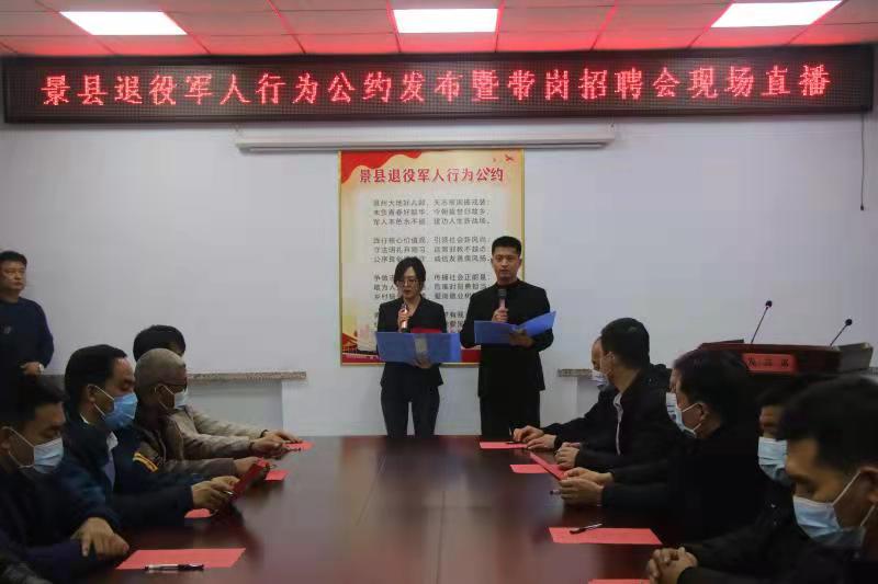 “爭做志愿服務者,傳播社會正能量;敢為人先闖新路,危難時刻勇擔當……”11月26日,我市景縣退役軍人事務局會議室內莊重嚴肅,一場別開生面的《景縣退役軍人行為公約》(以下簡稱《行為公約》)發布會暨專崗招聘會正在這里舉辦。來自全縣各行各業的25名退役軍人代表,以及縣工商銀行、農業銀行、消防大隊、名企代表現場參與,同時還有6000余人通過退役軍人視頻一體化平臺和抖音平臺同步觀看。
