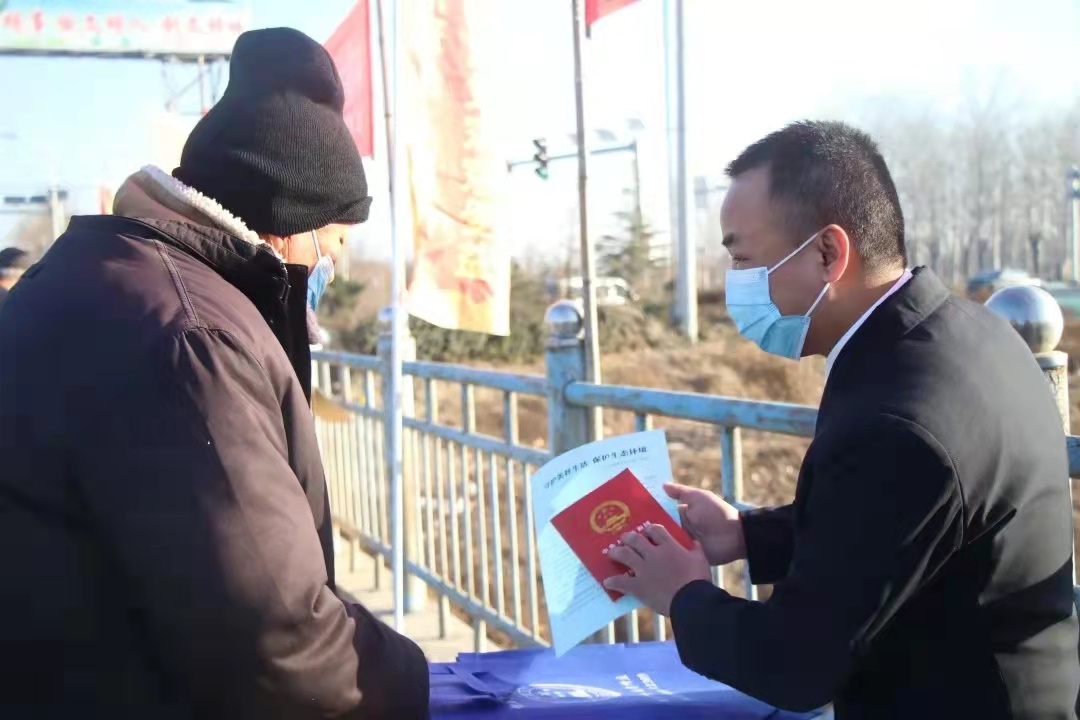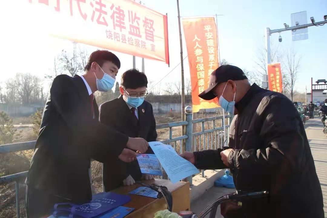 普法宣傳員為群眾發(fā)放普法宣傳手冊(cè)。饒陽(yáng)縣融媒體中心供圖