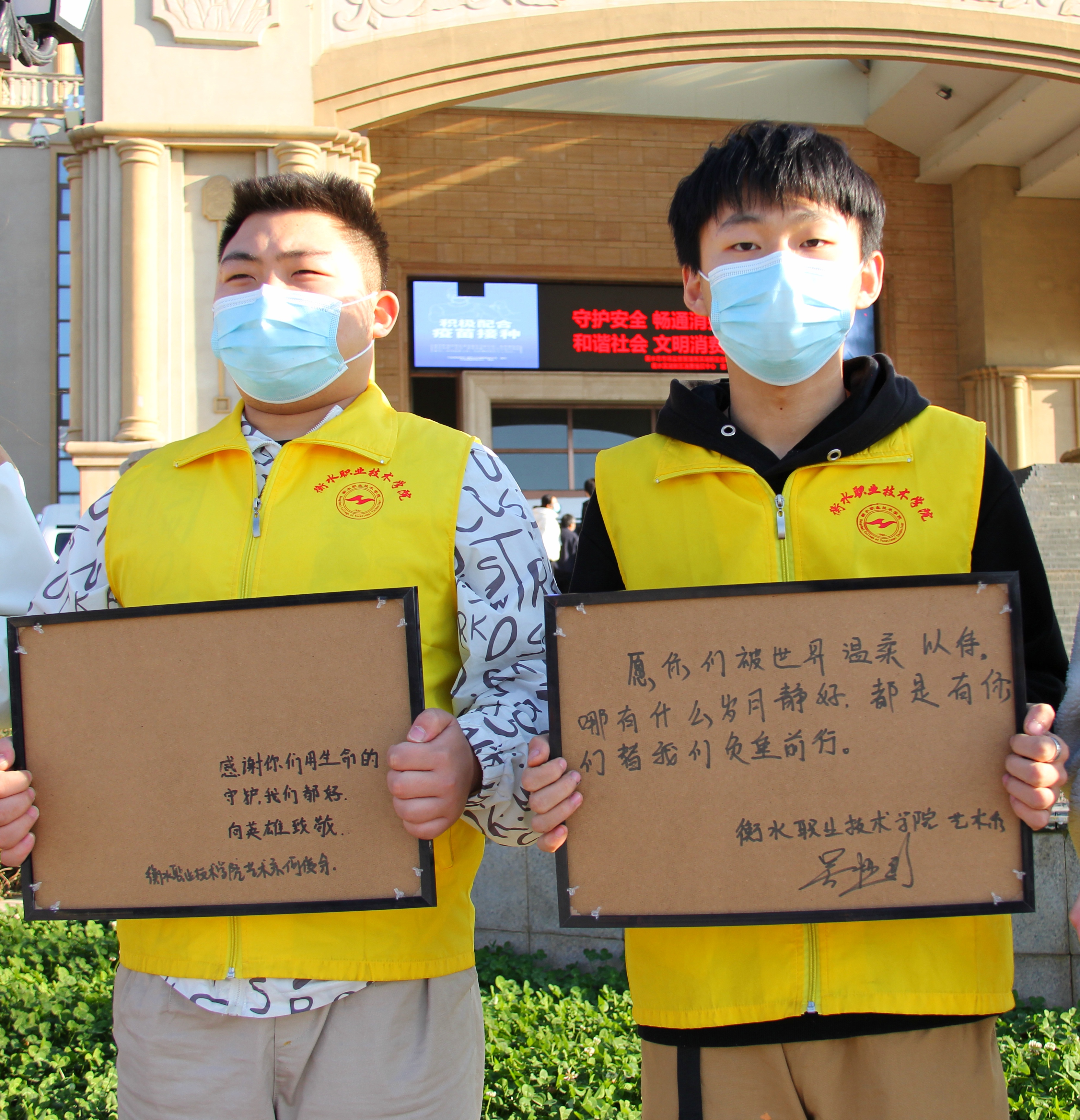 隨后,10名來自衡水職業技術學院藝術系的學生,邁著整齊的步子來到醫護人員面前,獻上用心繪制的10幅畫作,以表敬意。“叔叔、阿姨,向你們致敬!”第一次如此近距離地站在“最美逆行者”身旁,學生們心潮澎湃、激動萬分。