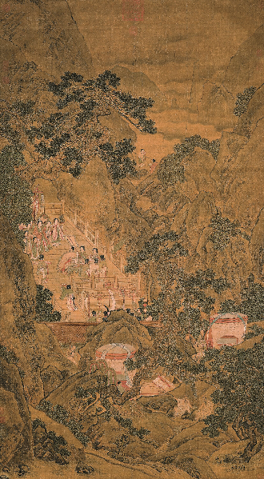 宋代劉松年繪《瑤池獻壽圖》局部,臺北“故宮博物院”藏。有人認為此圖描繪的是西王母會見漢武帝的故事,在古代確實流傳著二人相會的故事,但漢武帝是在人間會見西王母,西王母來之前還讓青鳥侍者報信,李商隱的“青鳥殷勤為探看”即言此。此圖描繪的是西王母在瑤池會見帝王,傳說瑤池在昆侖山,而周穆王曾到瑤池見過西王母,所以與西王母對坐的帝王應該是周穆王。李商隱有詩曰:“瑤池阿母綺窗開,黃竹歌聲動地哀。八駿日行三萬里,穆王何事不重來。”