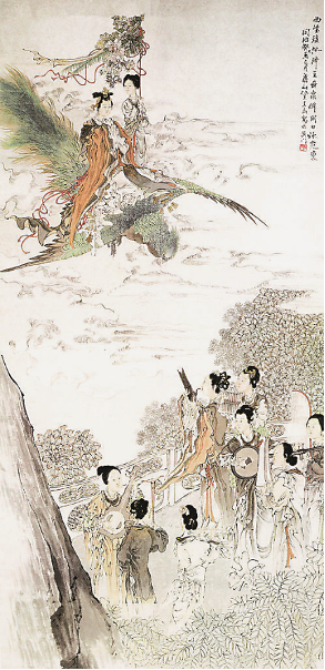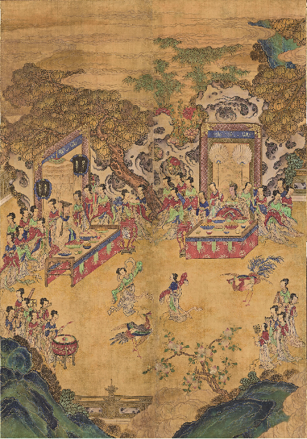 清代任薰繪《瑤池霓裳圖》。王母的居所由西昆侖變為天庭瑤池。仙樂飄飄中,王母乘彩鳳從云端降落。