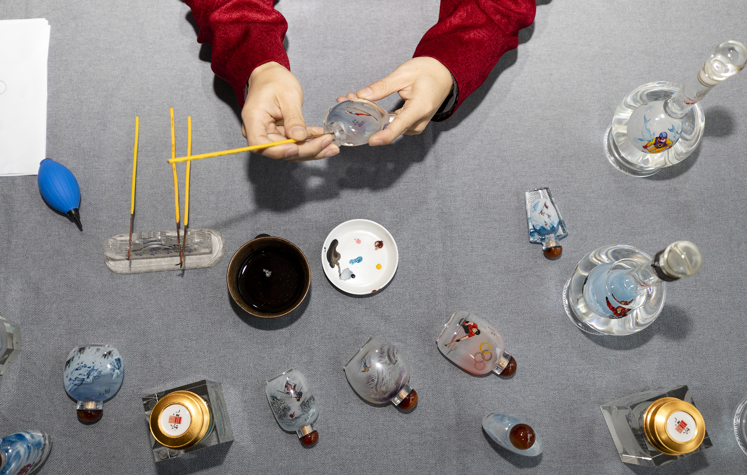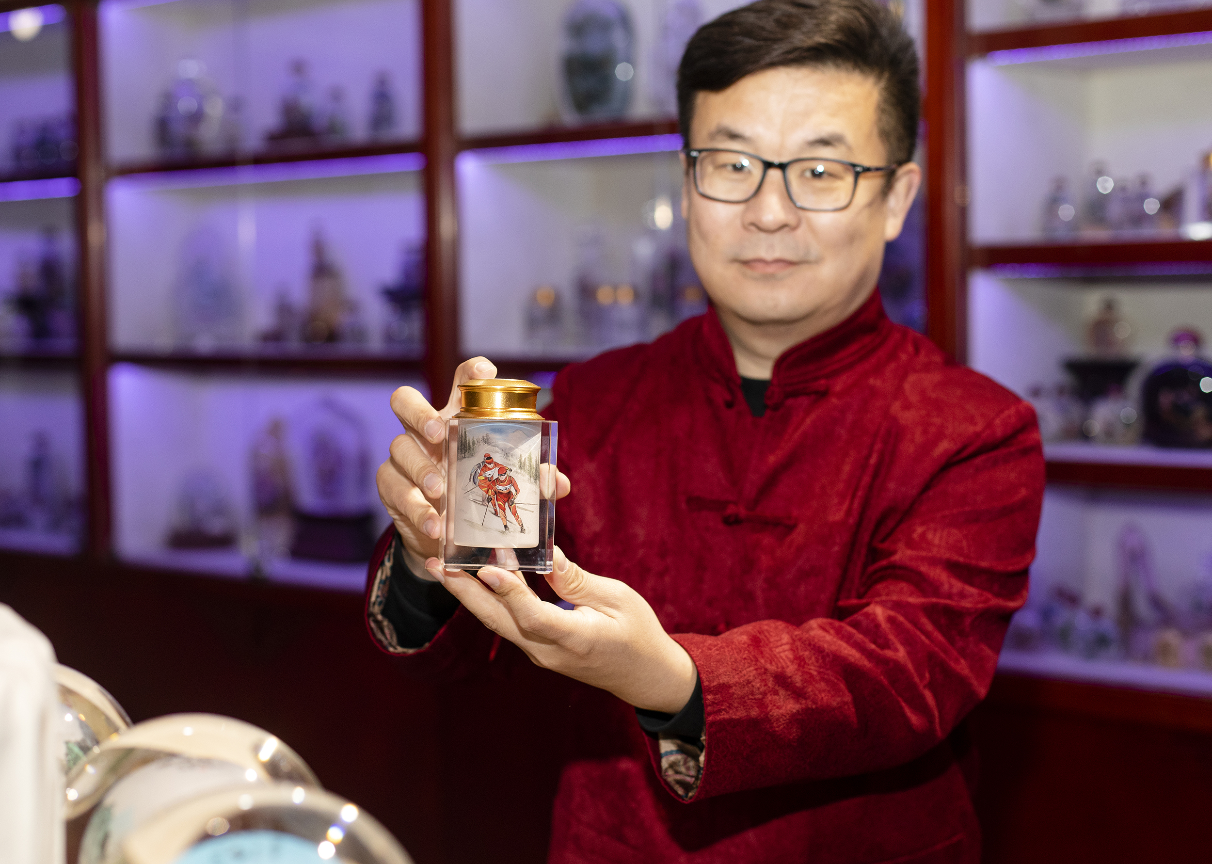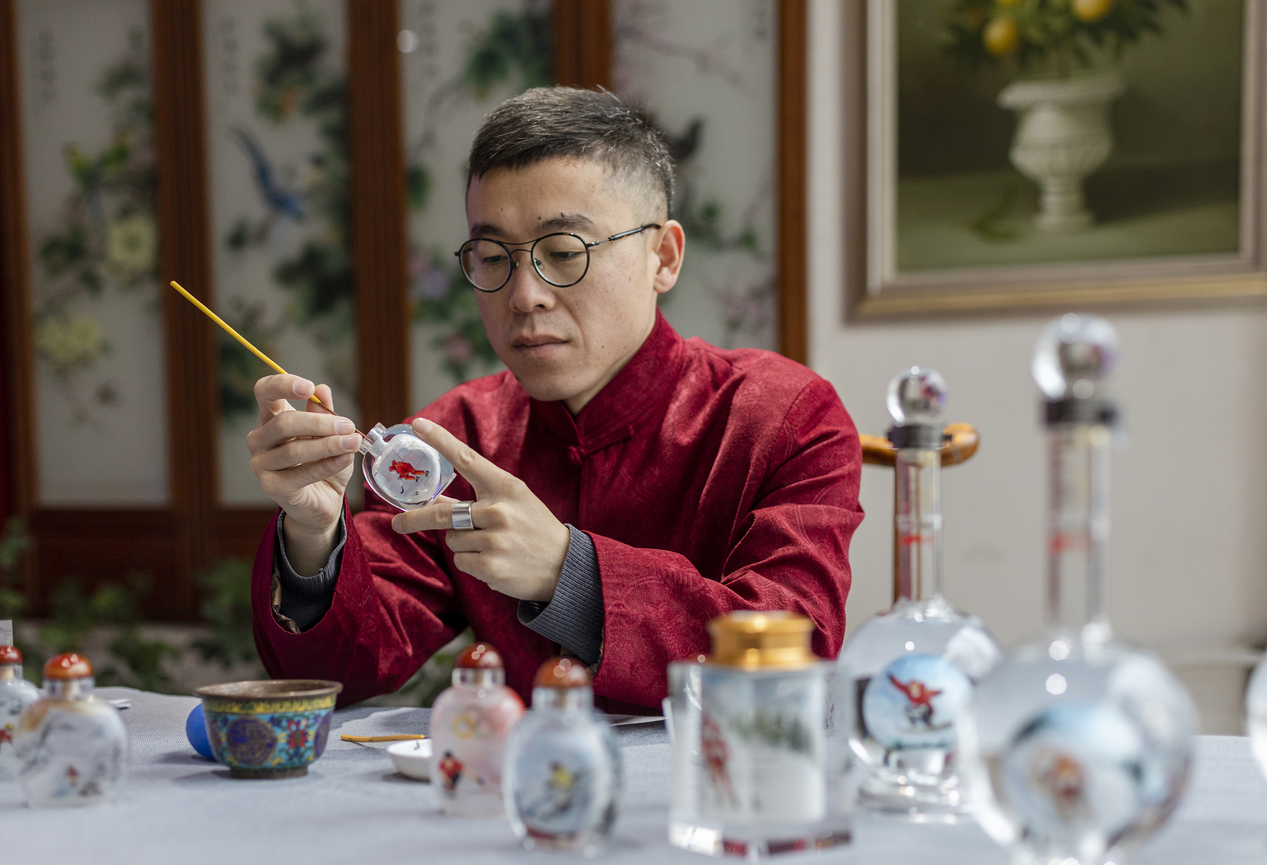 12月10日,內畫藝人粘躍峰正在創作“激情冬奧”系列內畫作品。