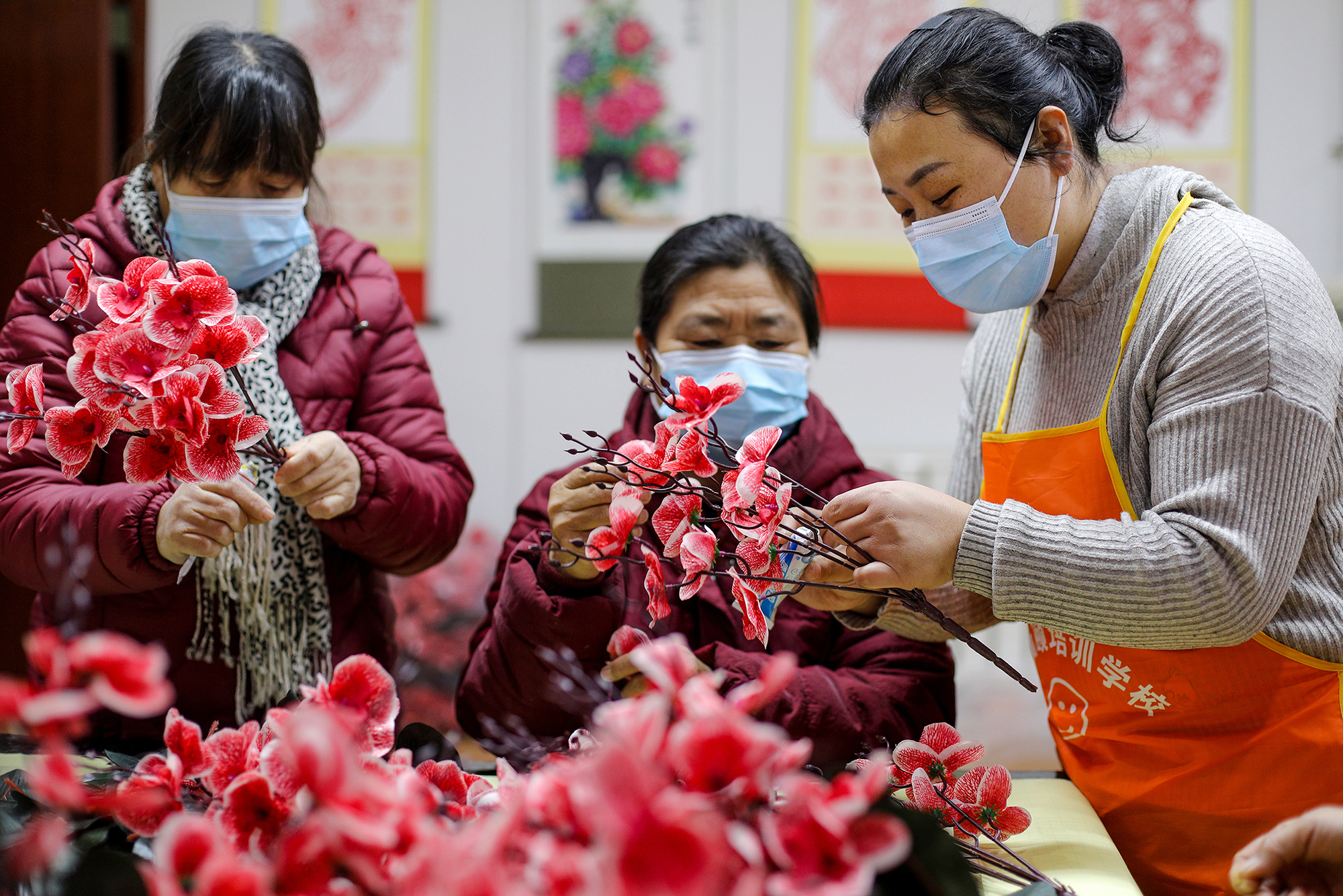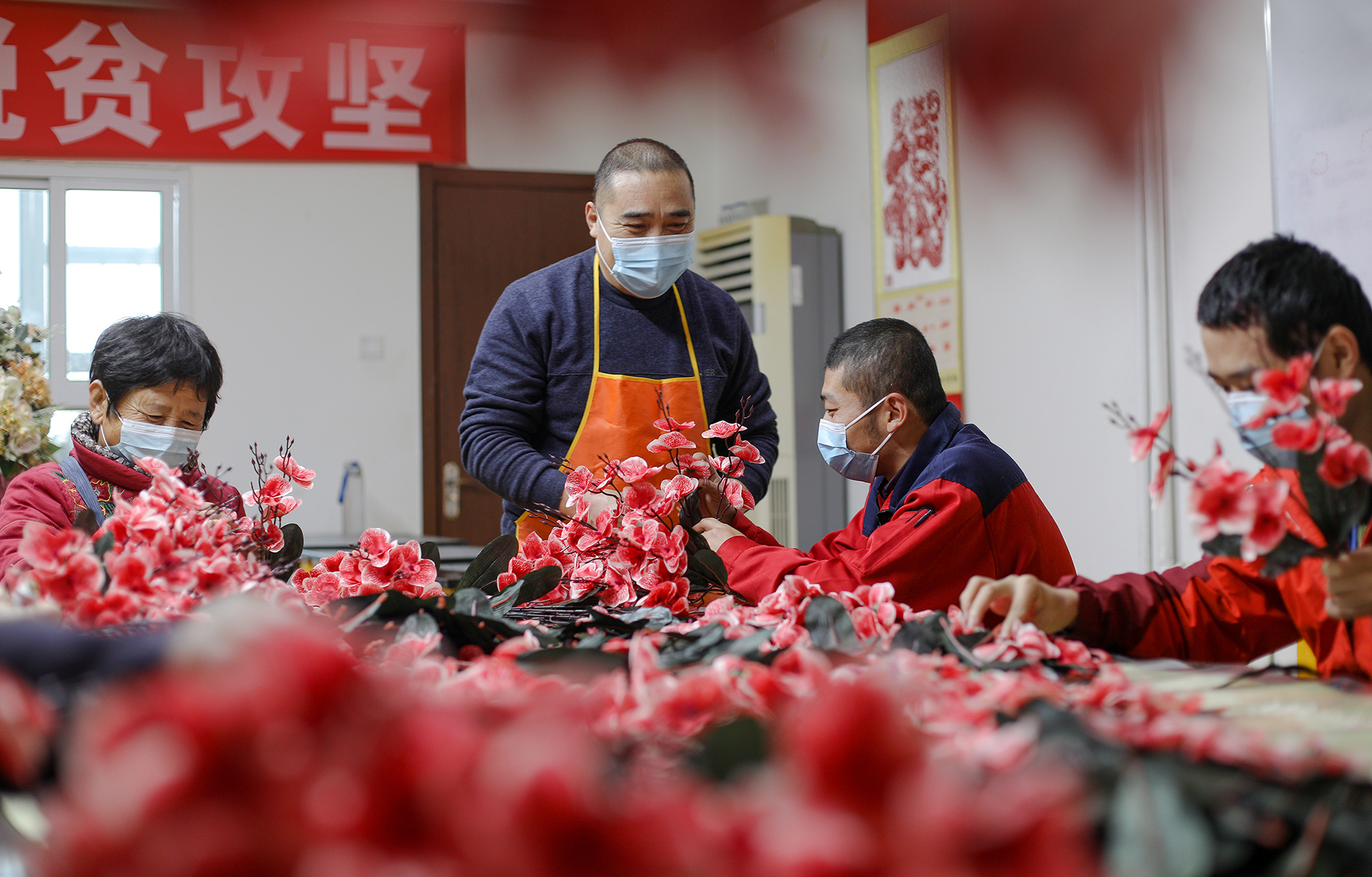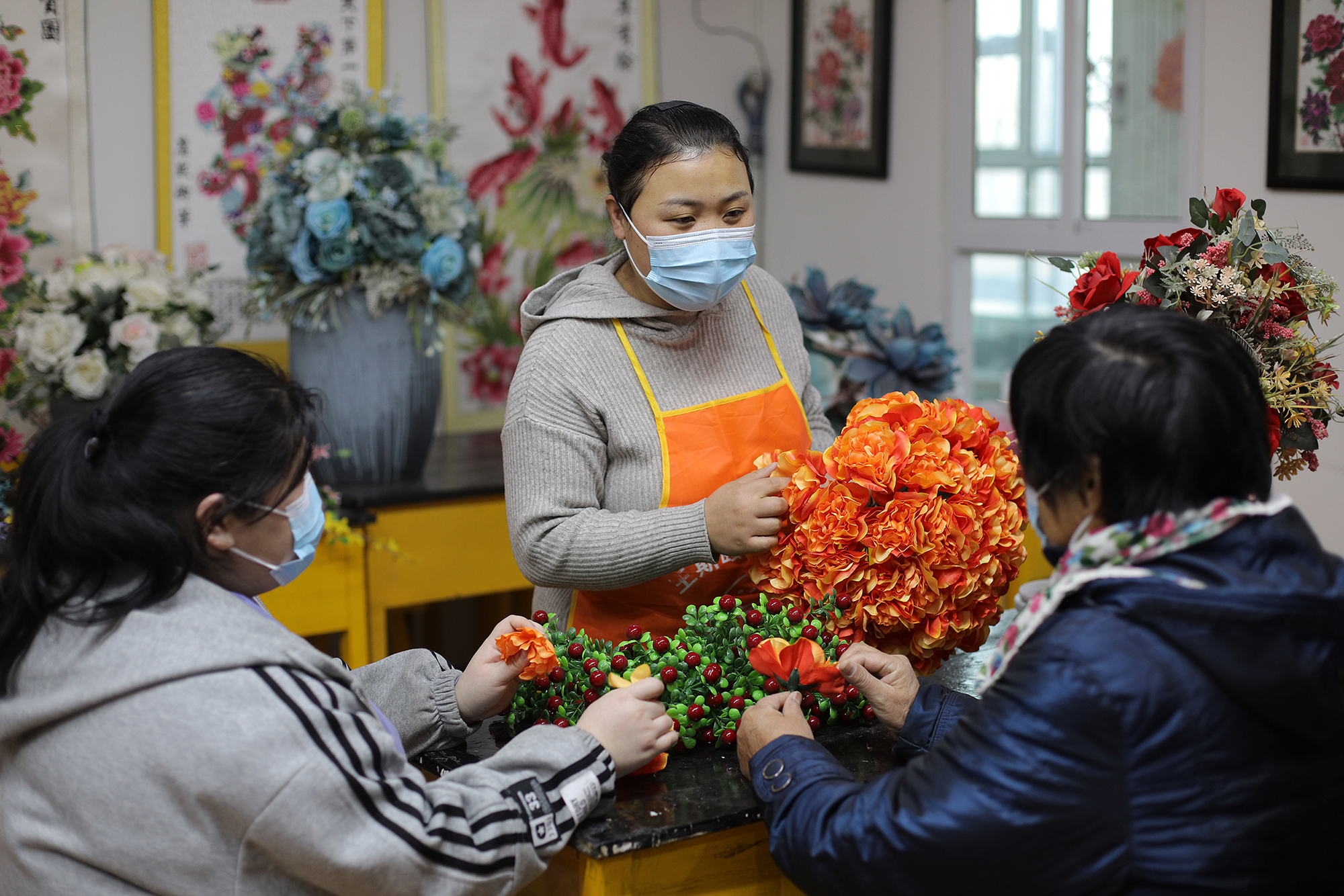 2021.12.14 在衡水市桃城區王斯頤職業培訓學校,培訓學校老師指導村民組裝絹花。