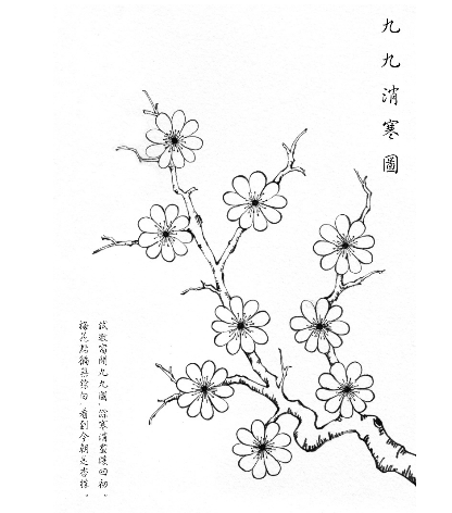 又有梅花九九消寒圖。元代楊允孚《灤京雜詠》卷下就詠道:“試數(shù)窗間九九圖,余寒消盡暖回初。梅花點遍無余白,看到今朝是杏株。”原注:“冬至后,貼梅花一枝于窗間,佳人曉妝,日以臙(yān,即胭)脂圖一圈,八十一圈既足,變作杏花,即回暖矣。”《帝京景物略》卷二:“冬至,畫素梅一枝,為瓣八十有一,日染一瓣,瓣盡而九九出,則春深矣,曰‘九九消寒圖’。”是在紙上畫一枝梅花,有八十一瓣,每天畫一瓣,素梅變紅成為杏花,就出九了。