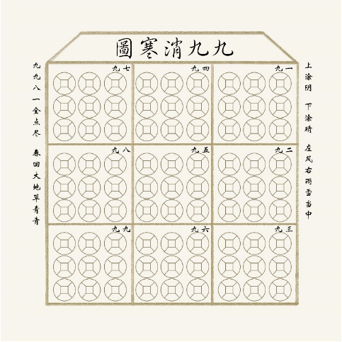 又有,《帝京景物略》卷二述:“有直作圈九叢,叢九圈者,刻而市之,附以九九之歌,述其寒燠(yù,暖熱之意)之候。”即一紙卷上印八十一個圓圈、注明日期,每天用朱紅色染一圓,染盡就出九了。