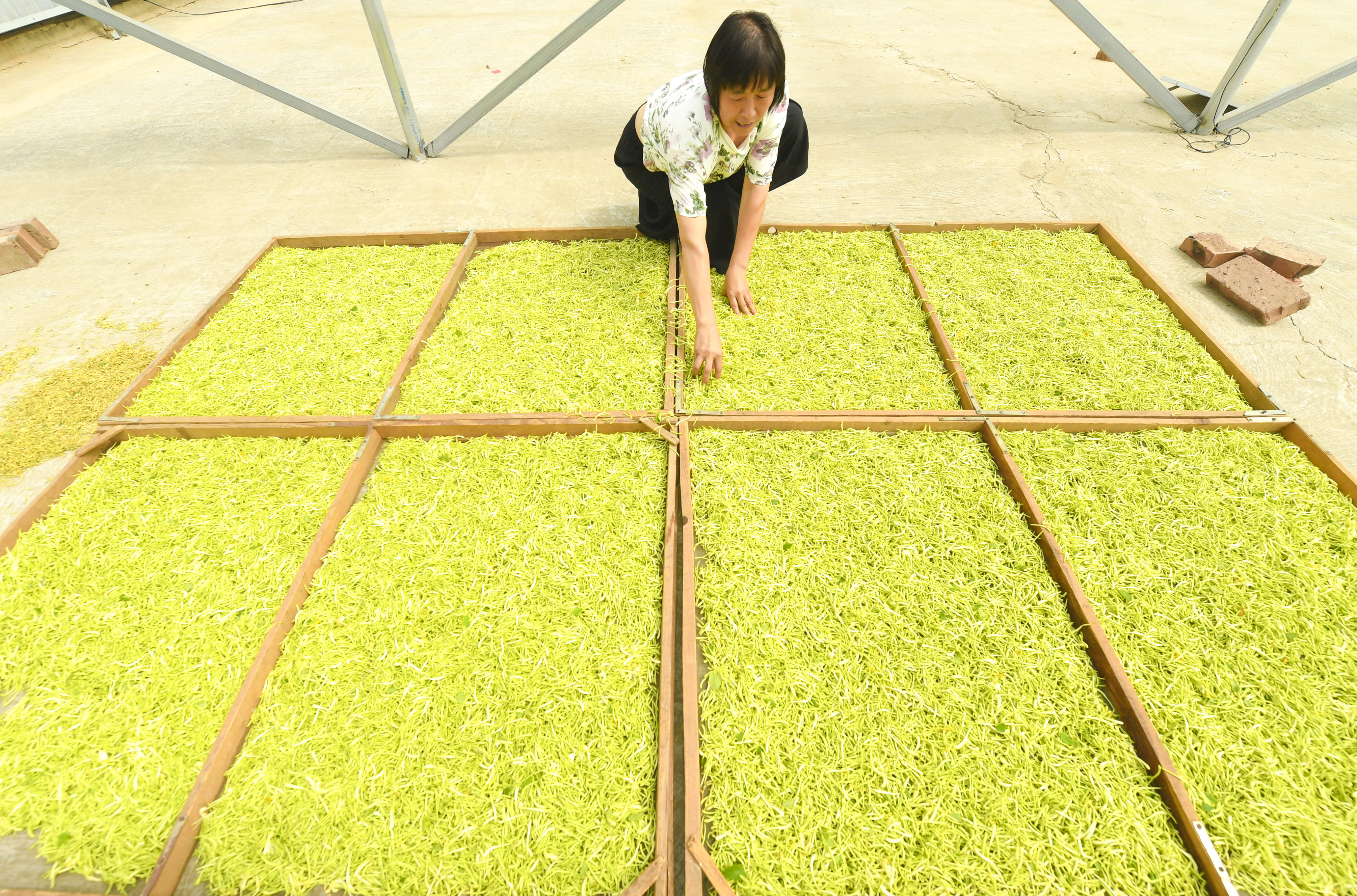 景縣令貴種植業農民專業合作社的農民晾曬金銀花。(資料圖)高雷 攝