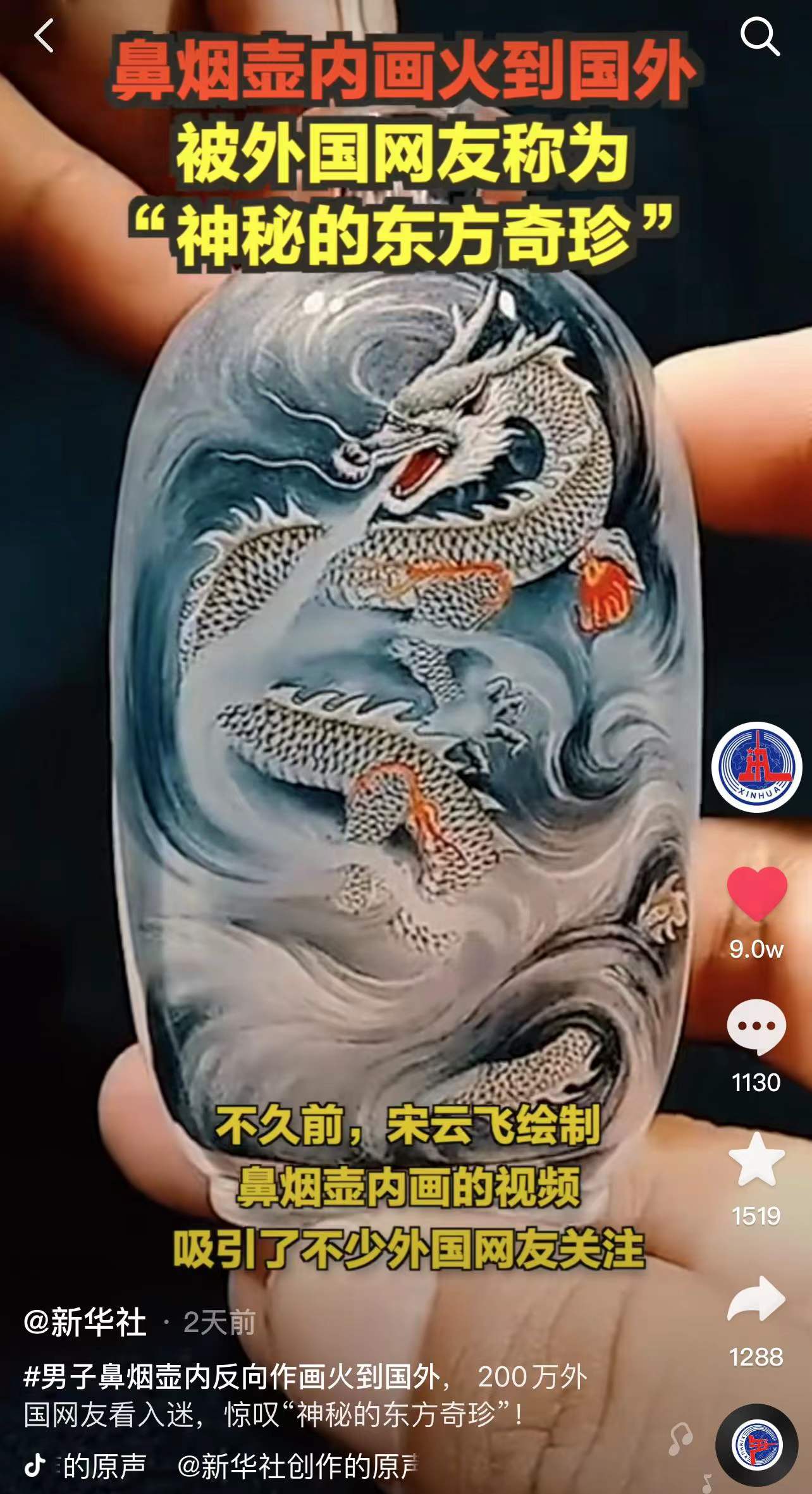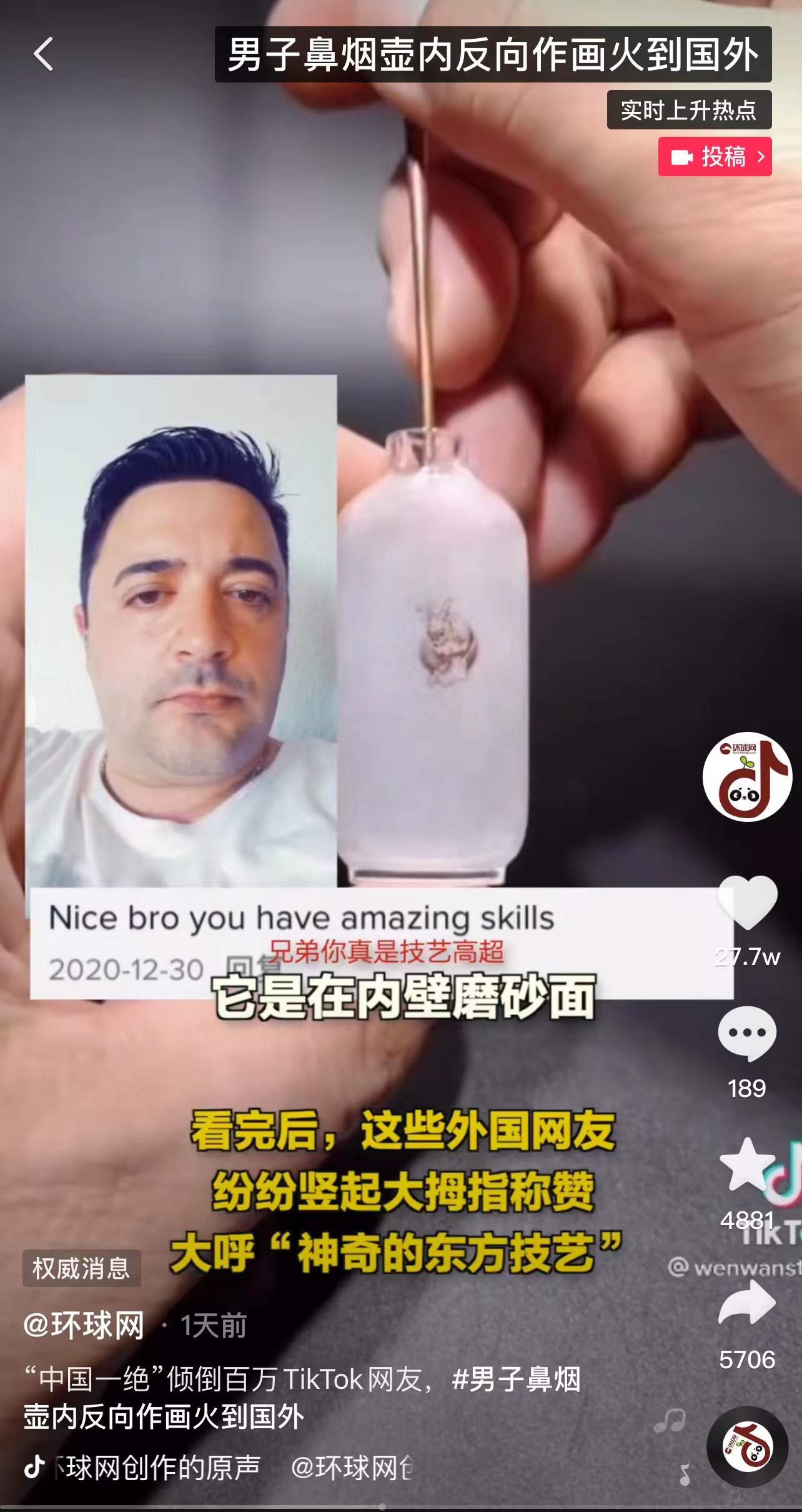 “我在紙上都畫不出來”“太美了,竟然有這種技藝”“有沒有人告訴我這到底是什么技藝?”……TikTok用戶loganparsley25分享繪制鼻煙壺內畫的視頻,超過210萬人觀看,獲贊約14萬,許多網友看過視頻后留言,為中國這一傳統技藝點贊。記者了解到,在TikTok上,#snuffbottle(鼻煙壺)標簽下的視頻播放量已經超過140萬,用戶loganparsley25分享的一條關于鼻煙壺的視頻,播放量也早已超過210萬。宋云飛內畫視頻在海外爆火的消息,獲得新華社、環球網關注點贊。
