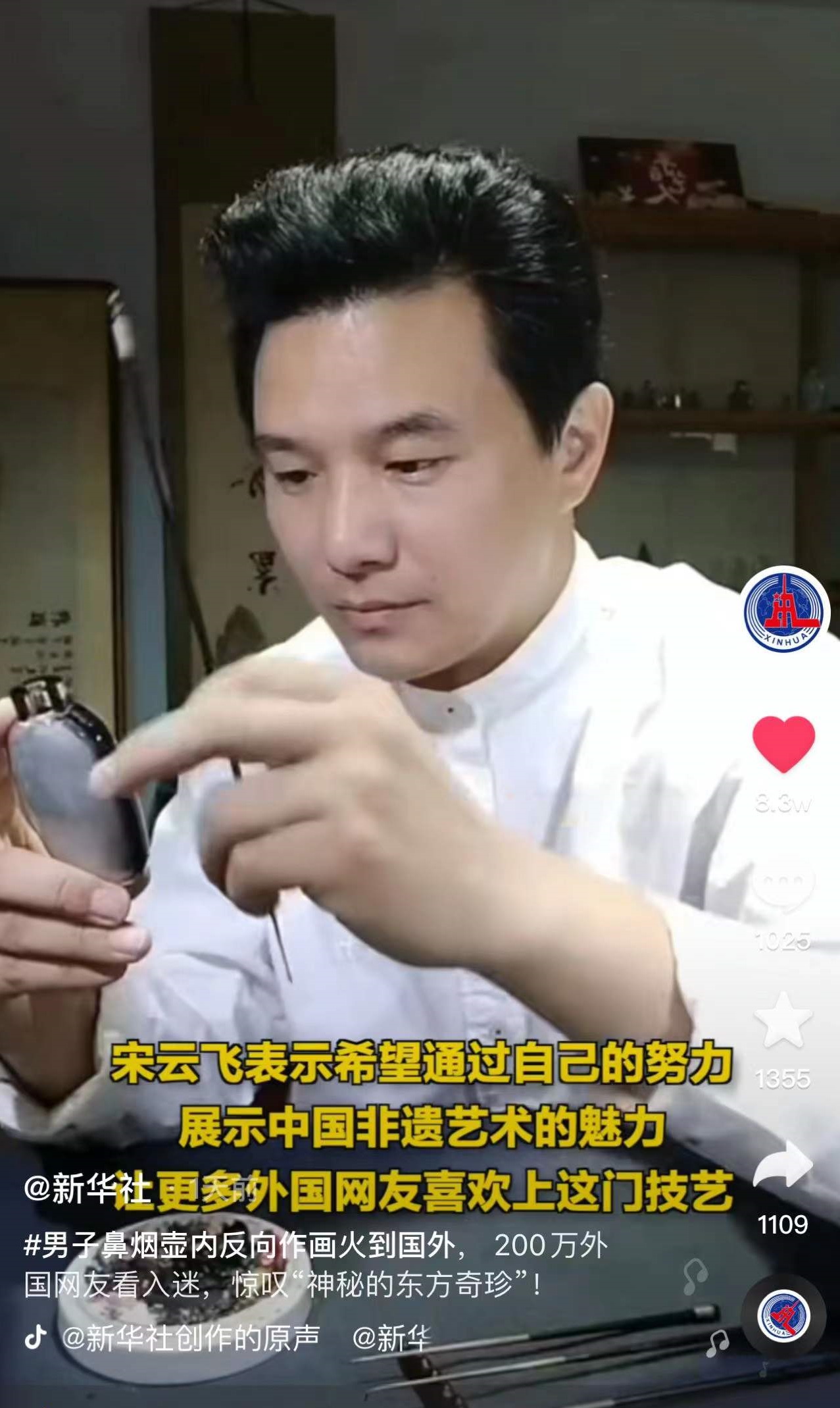 近日,一則內畫鼻煙壺繪制過程的視頻在國外TikTok網站上爆火,數百萬外國網友為中國內畫藝術驚嘆,視頻中繪制內畫鼻煙壺的手藝人,是我市內畫藝術家宋云飛。