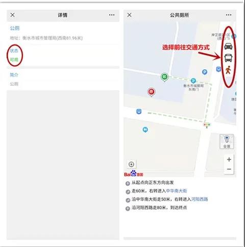 公廁是城市基礎設施,與市民生活息息相關。為方便市民游客準確查找公廁,衡水市城管局微信公眾號“衡水城管”推出了“公廁查詢”功能,根據衡水實際情況,組織市、區兩級城管部門對公廁數據排查核實并進行優化。市民或游客進入“衡水城管”微信公眾號,在下方點擊“快捷服務”中的“公廁查詢”后,系統將根據用戶定位自動查找出距離最近的公廁,并通過選擇駕車模式或步行模式,顯示文字導航信息,跟著“公廁導航”走便能在最短時間,到達距離自己最近的公廁。點擊“公廁”字樣還可顯示該公廁具體地址、狀態是否可用等信息。