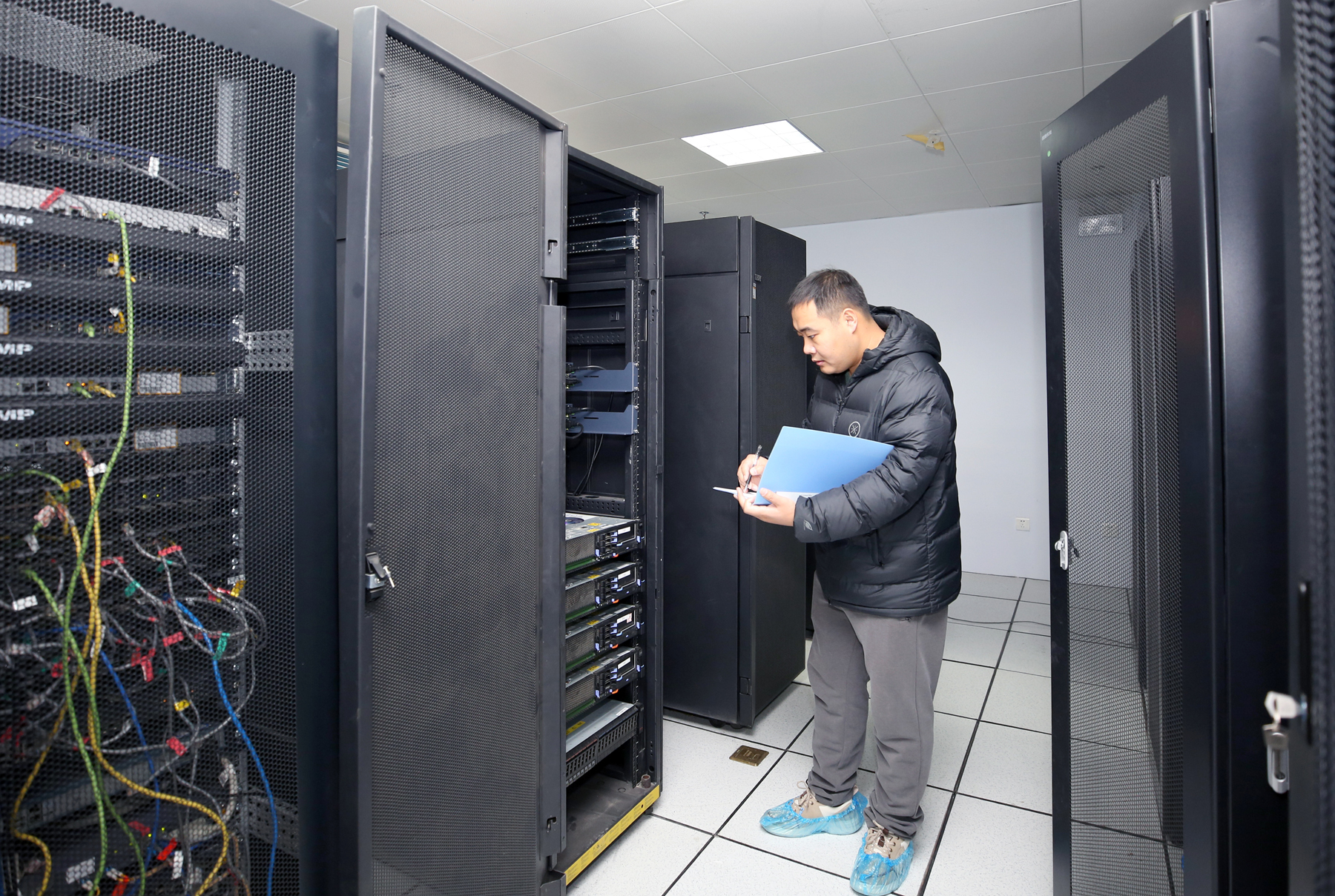 在公積金管理中心總機房,房工作人員正在巡檢設(shè)備。