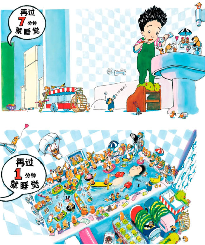 爸爸說還有10分鐘就要睡覺了,但小男孩還沉浸在自己的故事空間里。在爸爸的倒數聲中,他一邊刷牙、洗澡,一邊玩得不亦樂乎,等待著他的一大車隊的動物朋友們來光臨他的房間……他可不在乎10分鐘是什么,只是不得不把他的故事控制在爸爸有節奏的催促中。