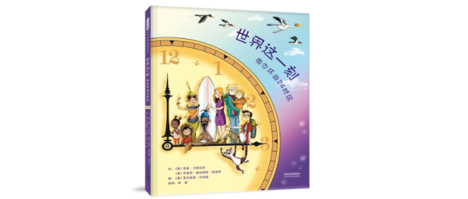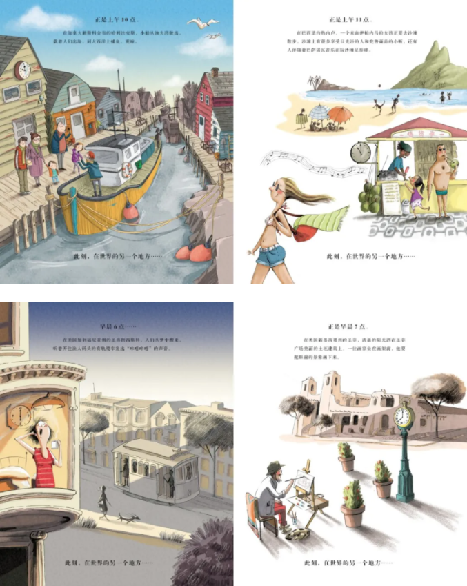 這本書展現的是在同一個時刻時,世界上的24個時區中正在發生各種精彩的事情,左右兩幅畫上的事物和人們的穿著形成鮮明對比,幫助讀者理解地球上的時差,不同地區的習俗、著名建筑以及當地居民最富有特色的生活方式。