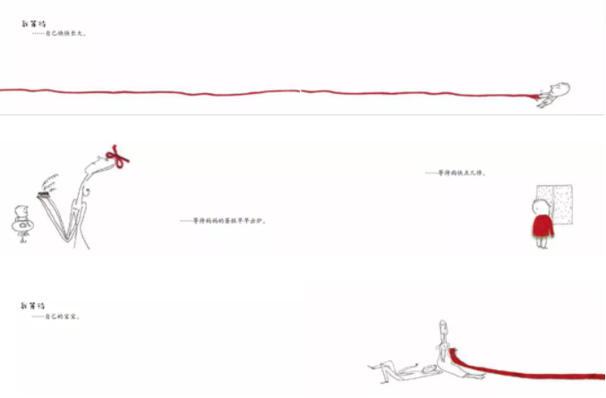 這本書采用了像長長的信封一樣的裝幀形式,用一根紅線串起人生的不同片段。人們對時間的感知是五味雜陳的,小時候等待快快長大,等待臨睡前的吻,等待周末……長大了等待愛情,等待電影開場,等待自己的寶寶,……中年以后等待孩子的電話,等待有人按響門鈴……這一生的等待背后是我們對時間的無可奈何嗎?