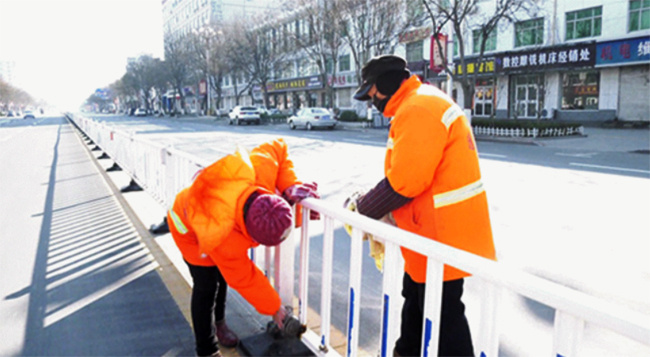 環(huán)衛(wèi)工人擦拭道路上的護(hù)欄。景縣融媒體中心供圖
