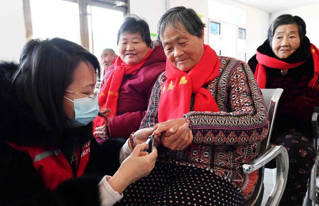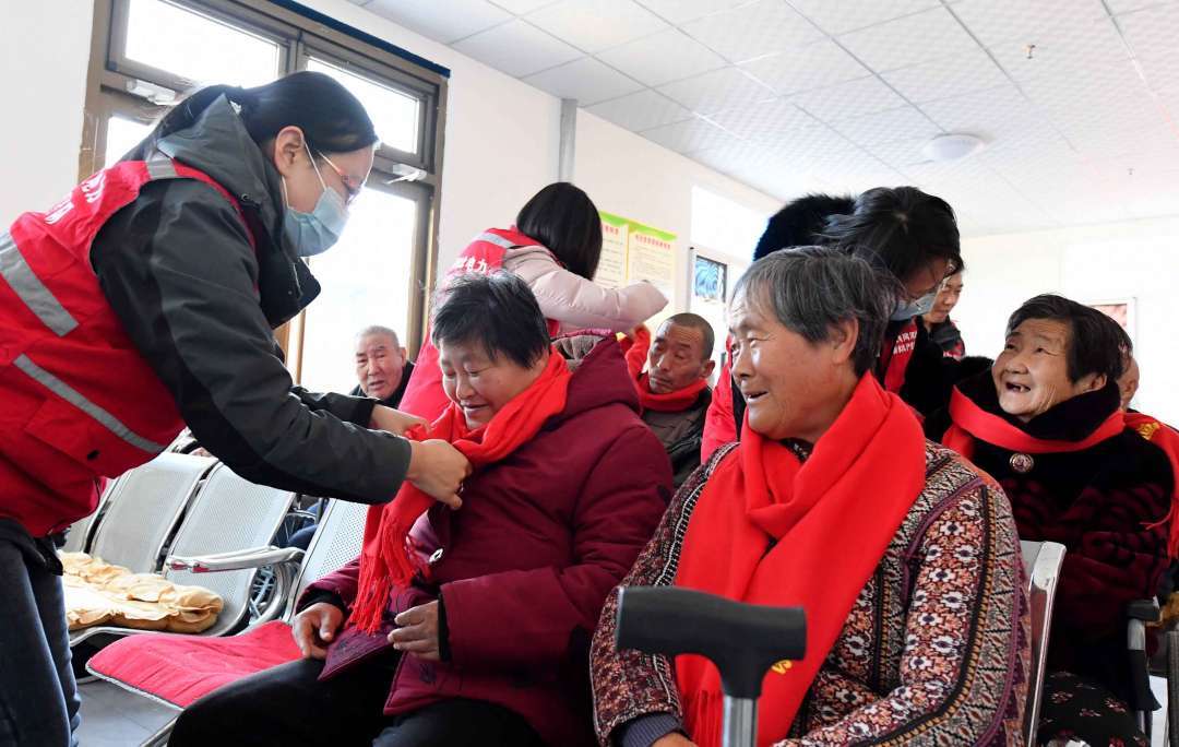志愿者給老人們系上紅圍巾,送去新年的祝福。蘇小立 攝