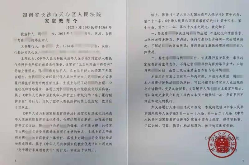 全國首份《家庭教育令》 圖片來源:天心區(qū)法院