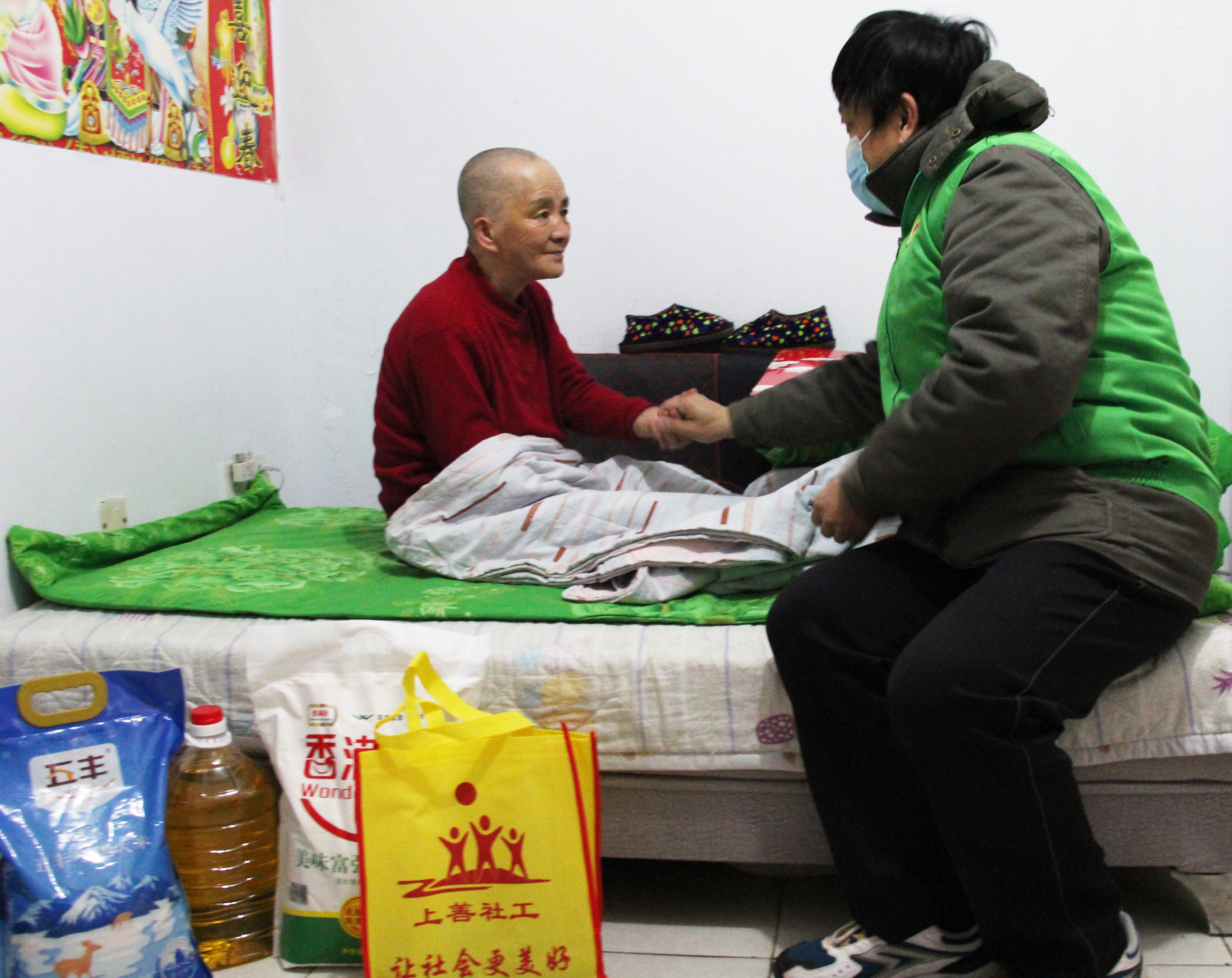 “天氣冷,要注意防寒保暖、保護身體!”提著米、面、油,帶著新春對聯和八寶粥,志愿者一大早就來到困難戶張曉偉的家里。張曉偉今年40多歲,患有腦溢血后遺癥,無兒女,岳母長期癱瘓在床,兩人生活都由妻子李艷秋照顧。據李艷秋介紹,丈夫今年已經能下地走動,母親精神也很好,與去年相比家里情況好了很多。