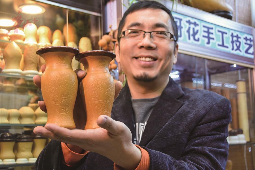 據了解,葫蘆文化經歷數千年的歷史積淀,以其獨特的歷史淵源、深厚的文化內涵以及廣泛的群眾基礎,在現代文化中仍占有重要的地位。葫蘆形體優美,色黃如金,寓意吉祥,賞玩者甚眾。葫蘆砑花手工技藝出現于清代晚期。砑花的原理與陽刻相似,用瑪瑙、玉、牙、金屬等制成的砑花刀壓下花紋周邊部分,使葫蘆表面出現凹凸不平的立體圖案。砑花不會破損表皮,葫蘆可以歷經百年長久保存,歷史價值極高。“葫蘆砑花技藝所用原料為純天然葫蘆,綠色環保可再生,符合當今社會需求。”劉建春說。