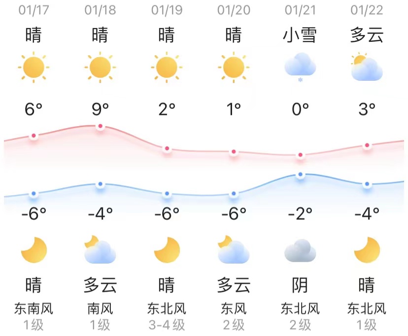 具體天氣預報為:1月16日夜間,多云轉晴,偏北風1~2級,最低氣溫-6℃到-7℃;1月17日,晴間多云,氣溫6℃到-5℃;18日,晴轉多云,8℃到-4℃;19日,晴間多云,3℃到-7℃;20日,晴轉多云,0℃到-1℃;21日,陰有小雪,1℃到-1℃;22日,多云轉晴,1℃到-1℃;23日,多云,2℃到-2℃。