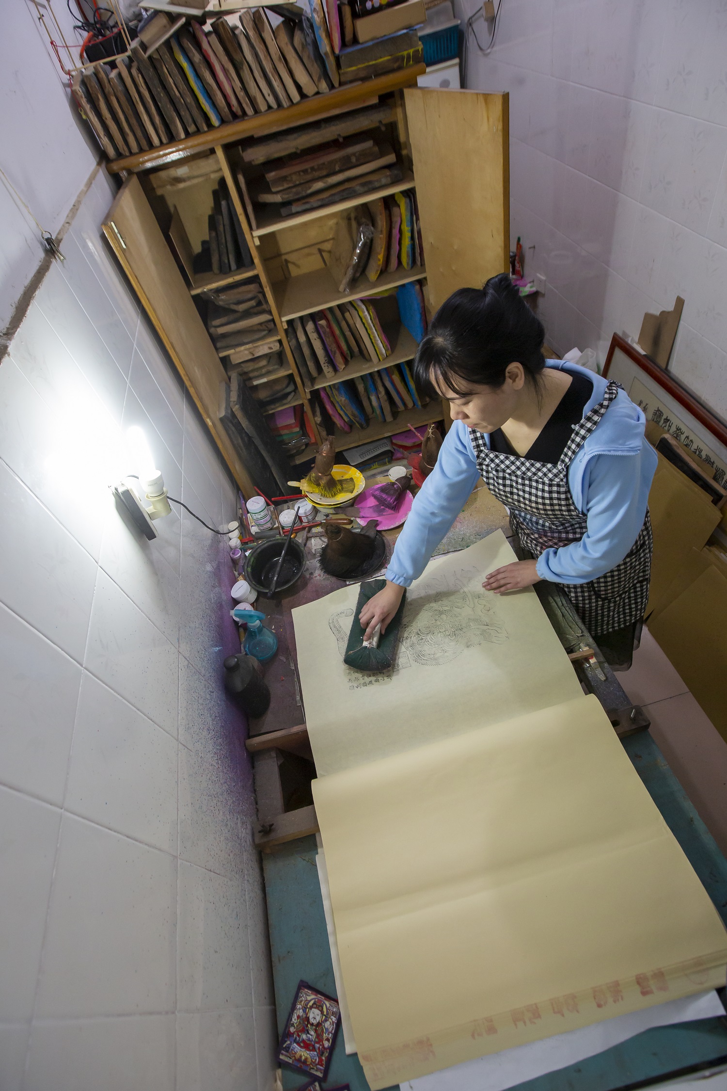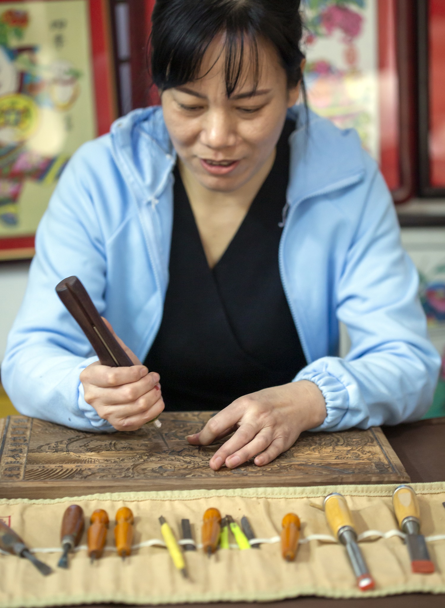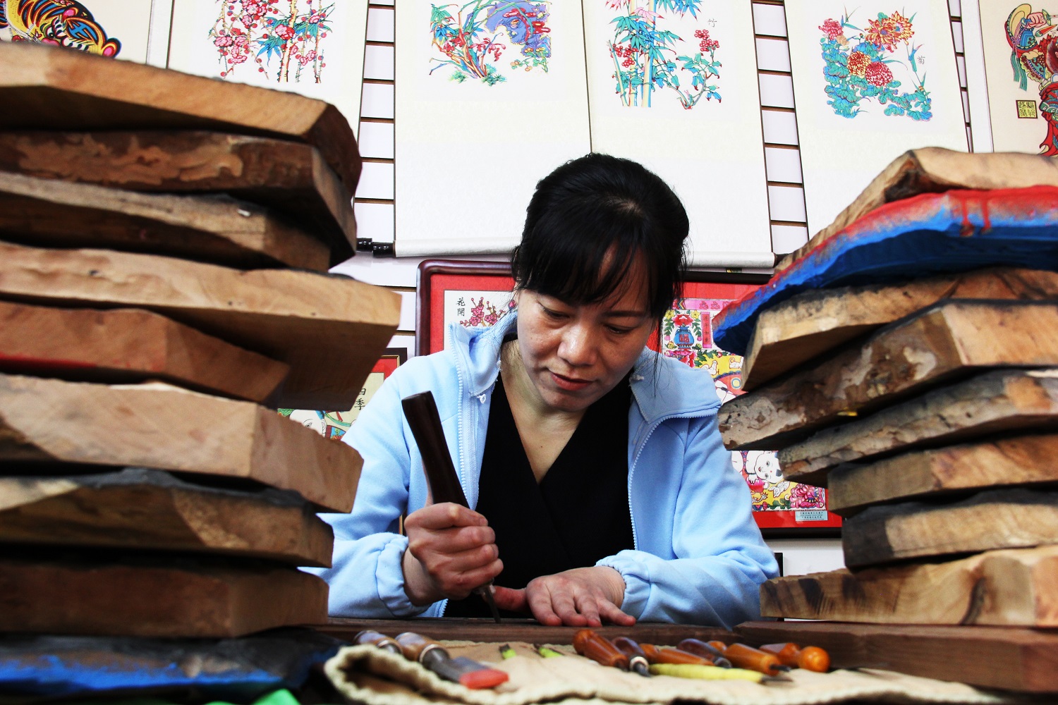 2006年,辛艷君開了一家淘寶店,專賣武強木版年畫,隨著生意越來越紅火,客戶的需求也開始多樣化。“有人專門要刻版,因為貨源緊張,我決定自己學。”她找到了武強年畫國家級非遺傳承人馬習欽,一心學習刻版技藝。為了尋找合適的刻版木材,她三番五次驅車前往滄州,從當地農戶手里收購木頭。刻刀不離手的日子里,辛艷君手上不知磨了多少水泡,時間久了,水泡又變成厚厚的老繭。