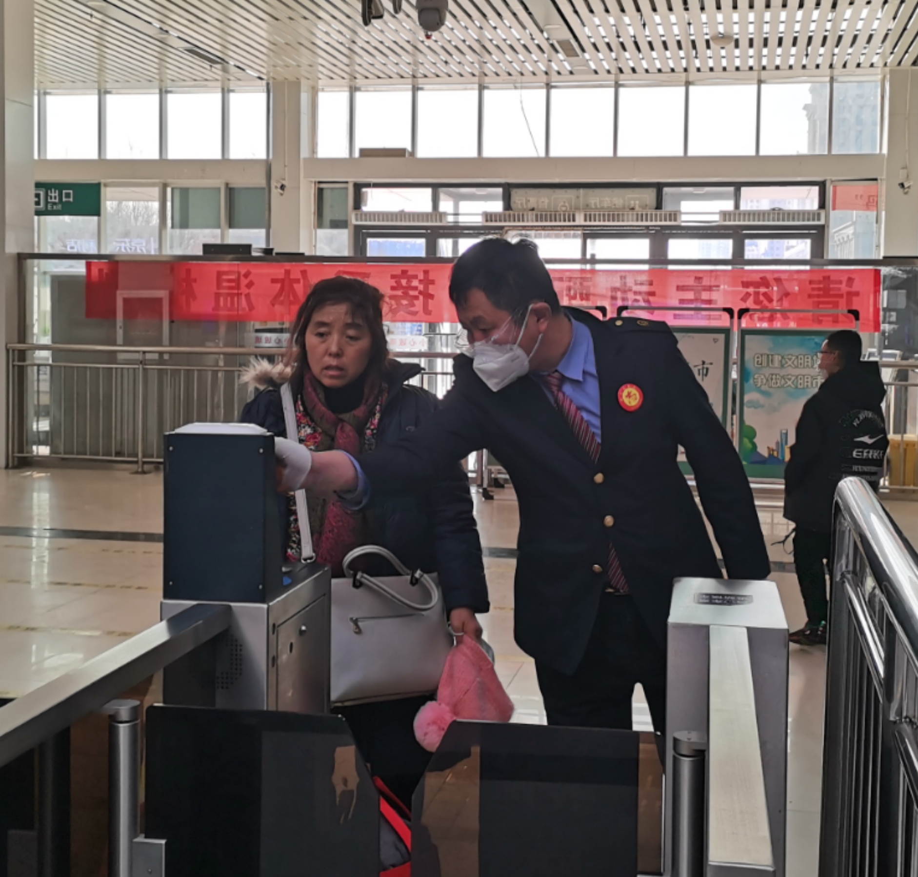 “您好,請刷身份證件穿過閘機。”安檢過后,旅客需要通過自助核驗閘機“刷臉”進行實名驗證驗票,人臉、火車票、身份證都相符方可進入候車廳。針對帶孩子的旅客、沒有身份證或者其他原因不能通過自助核驗閘機的旅客,火車站專門開通了人工檢測通道,檢測合格后便于旅客快速通行。“這位旅客,您還沒有購票,請到旁邊售票廳購票后再通過閘機。”一位旅客在閘機刷身份證時,突然閘機提示音響起,閘機并未開啟。工作人員李小龍立即走過去檢查,并耐心告知如何解決。
