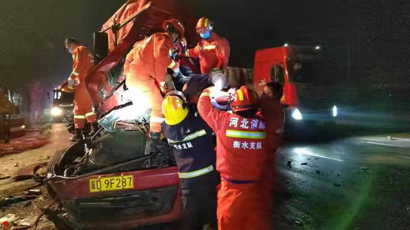 1月19日4時15分,衡水市冀州區消防救援大隊接到報警稱,位于106國道冀州彭村附近兩輛半掛車追尾,一人被困,接到命令后,冀州滏陽西路消防救援站立即出動1輛搶險救援車、1輛城市主站車和12名消防救援人員前往現場進行處置。