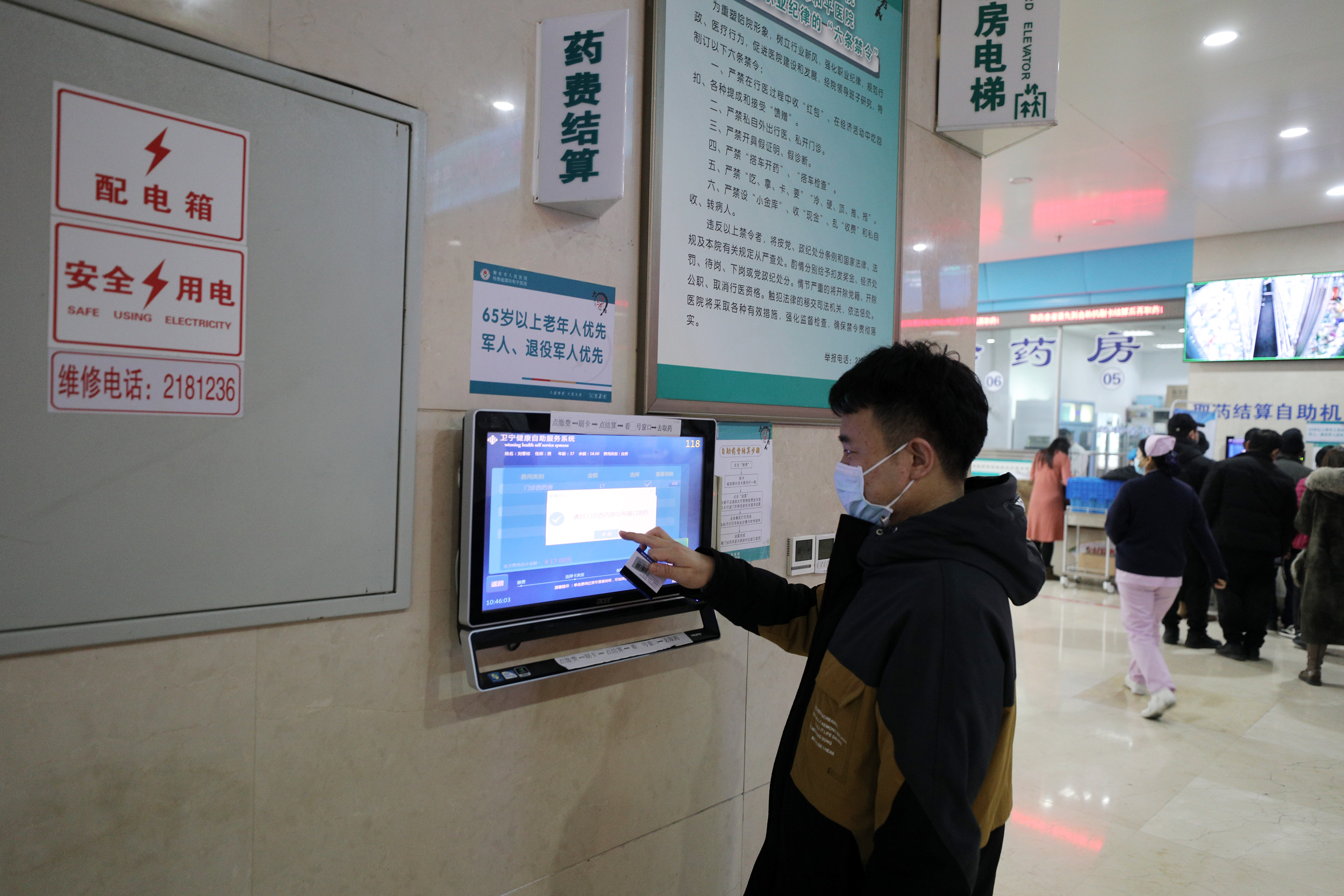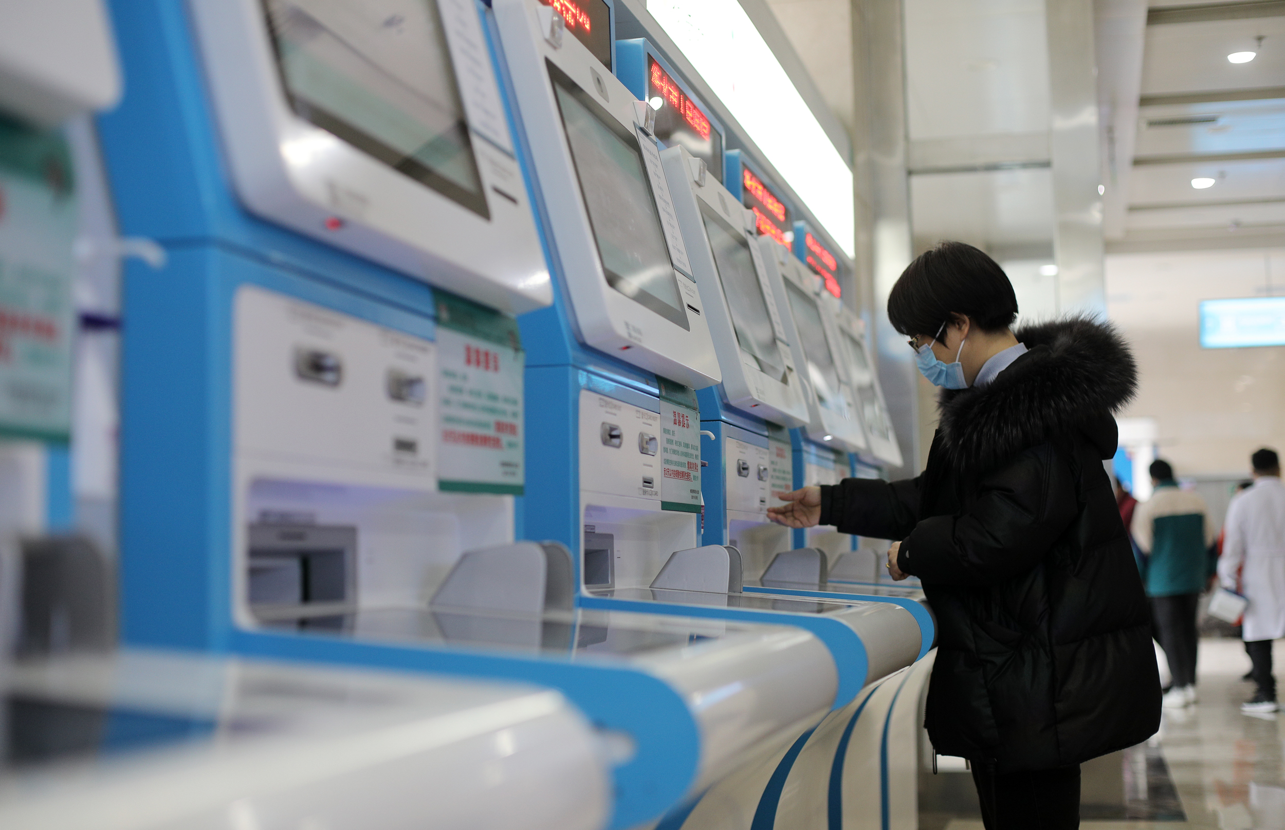一名患者正在通過門診大廳的自助機(jī)進(jìn)行約診。