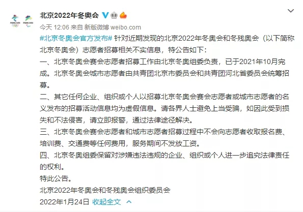 24日,針對(duì)近期發(fā)現(xiàn)的北京2022年冬奧會(huì)和冬殘奧會(huì)(以下簡(jiǎn)稱北京冬奧會(huì))志愿者招募相關(guān)不實(shí)信息,北京2022年冬奧會(huì)和冬殘奧會(huì)組織委員會(huì)發(fā)布公告: