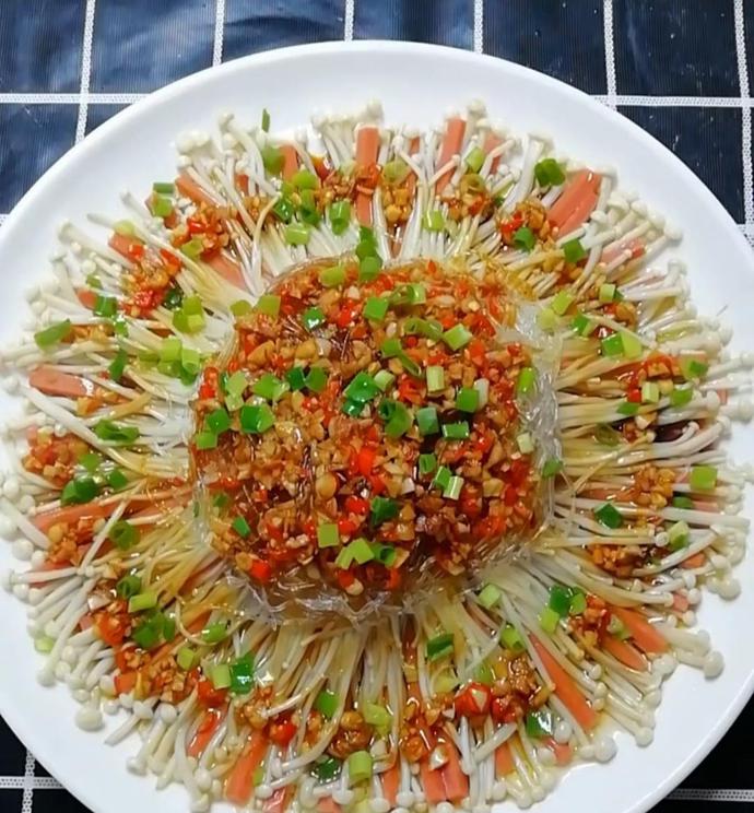 1、金針菇截去根部,撕成小縷,之后清洗干凈再擺在盤中?;鹜饶c切成細絲擺在金針菇上,再擺一層金針菇,一共是三層;