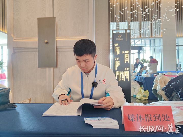 志愿者白一江在核對媒體記者登記信息。長城網·冀云客戶端記者 代晴 攝