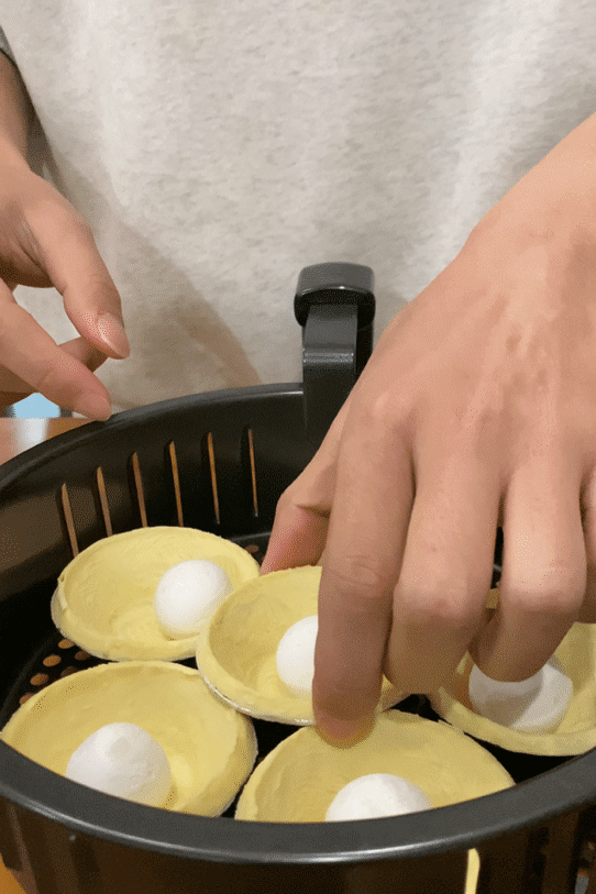 接著放入空氣炸鍋,180度,烤20分鐘左右,也可以用烤箱制作。因為每個空氣炸鍋或者烤箱的溫度不一致,所以中途觀察一下,表面金黃酥脆就可以了。