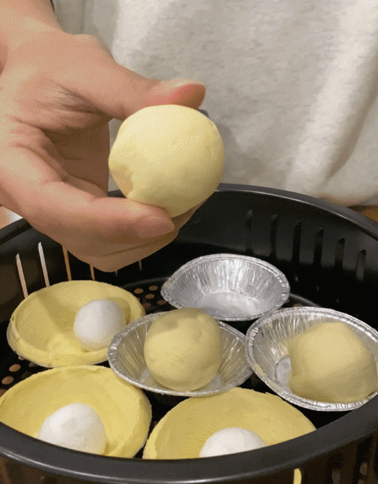 2、把湯圓放入蛋撻皮中,然后把蛋撻皮包裹起來,揉成一個圓形的球球,放回蛋撻皮的錫紙中,記得用牙簽,在表面戳幾個小孔,這樣烤的時候不會爆裂。