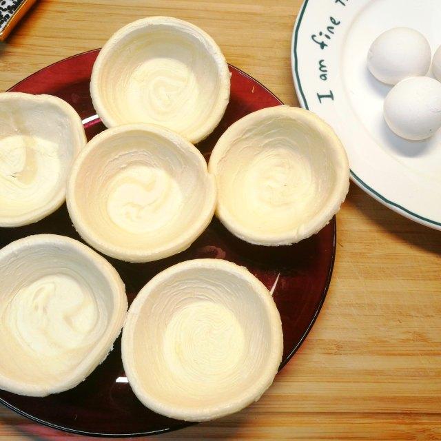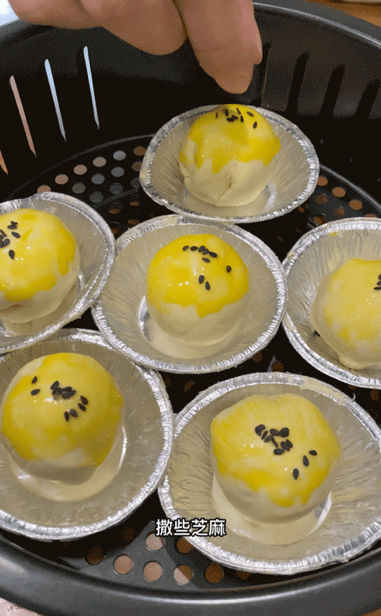 3、然后把雞蛋攪散,接著在蛋撻皮上刷上一層蛋液,然后撒些黑芝麻。
